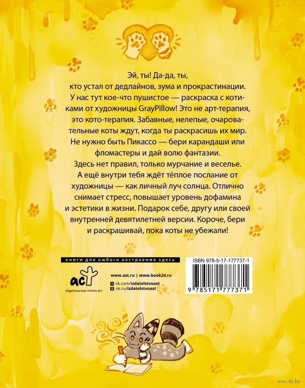 У нас тут кое-что пушистое – раскраска с котиками от художницы GrayPillow! Это не арт-терапия, это кото-терапия. Забавные, нелепые, очаровательные коты ждут, когда ты раскрасишь их жизнь. Не нужно быть Пикассо – бери карандаши или фломастеры и дай волю фантазии. Здесь нет правил, только мурчание и веселье.
