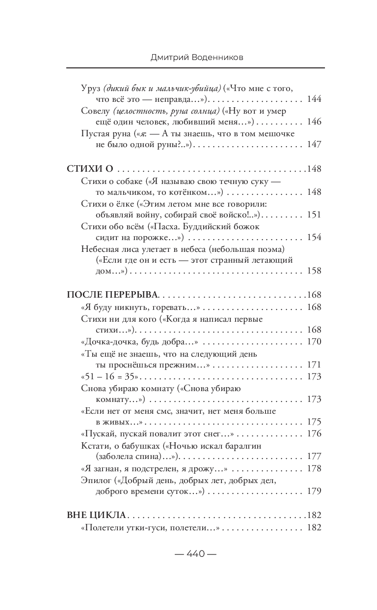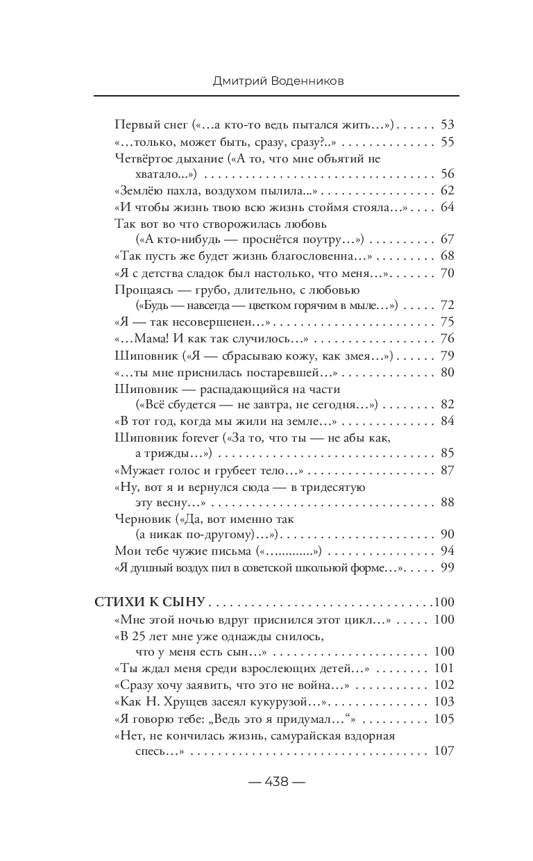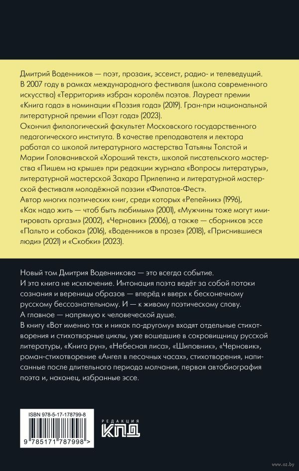 Новый том Дмитрия Воденникова – это всегда событие. И эта книга не исключение. Отдельные стихотворения и стихотворные циклы, уже вошедшие в сокровищницу русской литературы: "Книга рун", "Небесная лиса", "Шиповник", "Черновик", роман-стихотворение "Ангел в песочных часах", стихотворения, написанные после длительного периода молчания, и наконец избранные эссе – всем этим предстоит насладиться тебе, дорогой читатель. Интонация поэта ведёт за собой потоки сознания и вереницы образов – вперёд и вверх к бесконечному русскому бессознательному. И – к живому поэтическому слову. А главное – напрямую к человеческой душе. Вот именно так и никак по-другому.