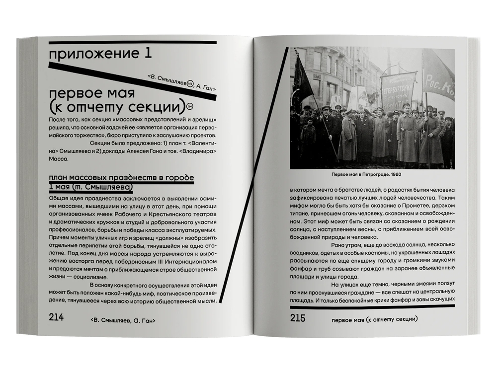 Пользуясь новым языком, Алексей Ган, Иван Аксёнов, Борис Арватов и другие авторы ставили вопрос о границах театра: является ли субботник или первомайская демонстрация теми перформативными формами, которые отвечают духу современности? Может ли установленная на площади декорация города будущего запустить процесс его архитектурного преображения?