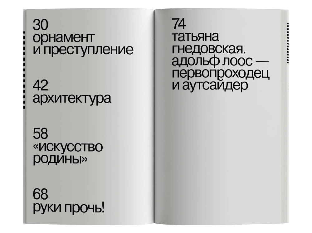 В заглавном тексте автор объявляет орнамент "преступлением" для цивилизованного человека и культуры. Радикальность его идей основана на отказе от украшательства и возвращении к функциональной и конструктивной правде.