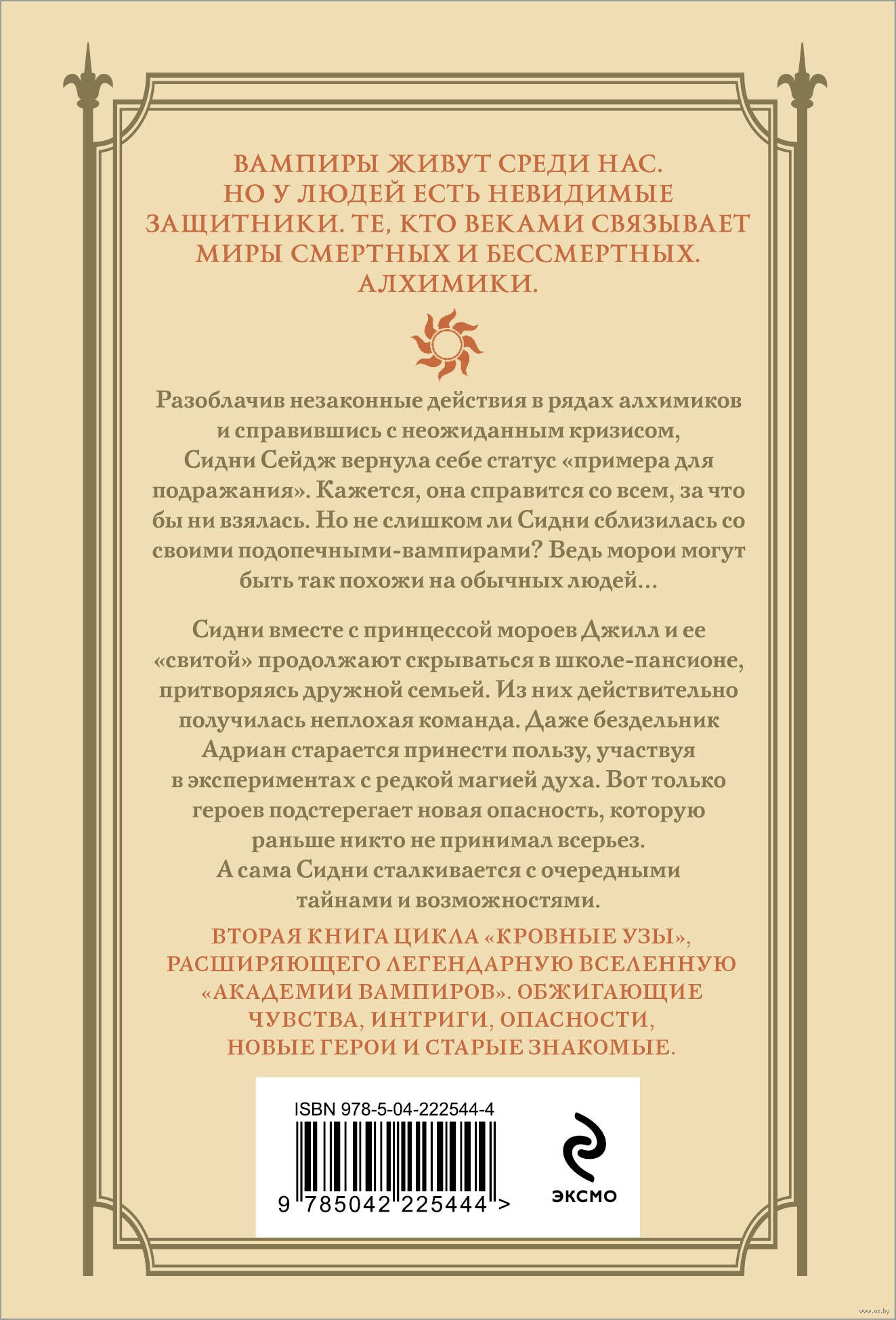 Сидни сумела вернуть себе доверие собратьев-алхимиков, но надолго ли? Один неверный шаг, и ее могут заподозрить в том, что она слишком сблизилась со своими "подопечными" вампирами. Ведь они действительно прекрасно поладили. Вместе Сидни, морои и дампиры проводят эксперименты с редкой и загадочной магией духа, и даже бездельник Адриан пытается взять себя в руки. Но вскоре всем героям придется признать, что в этом мире, где вампиры реальны, могут ожить и другие мифы.