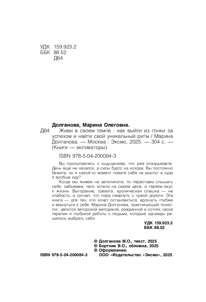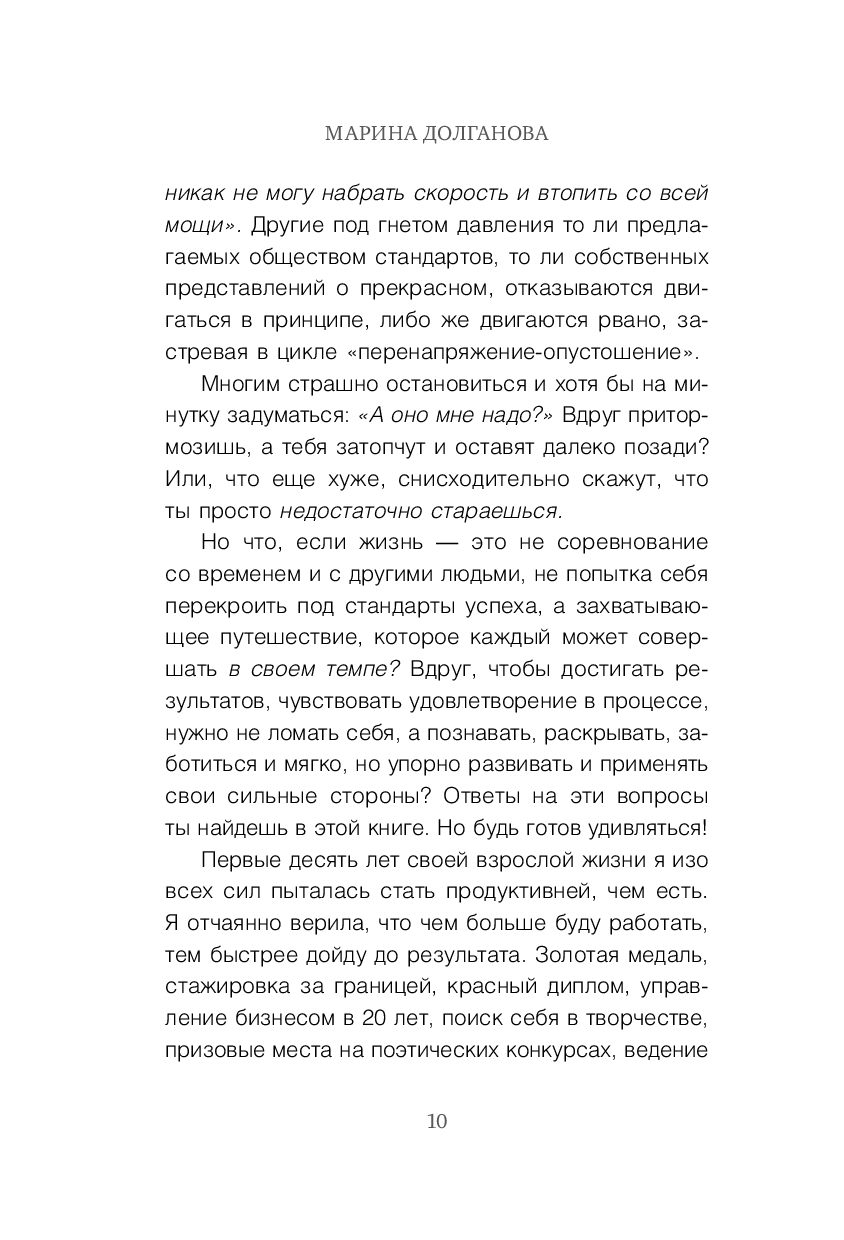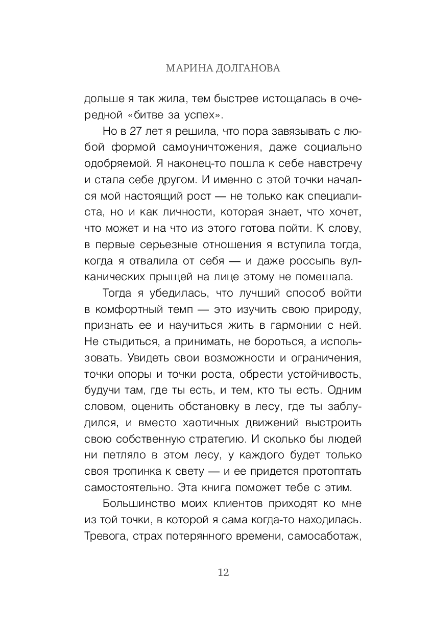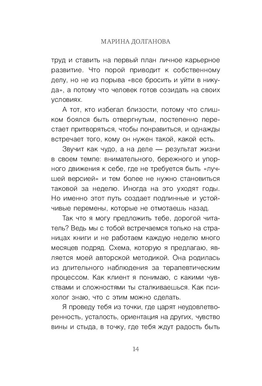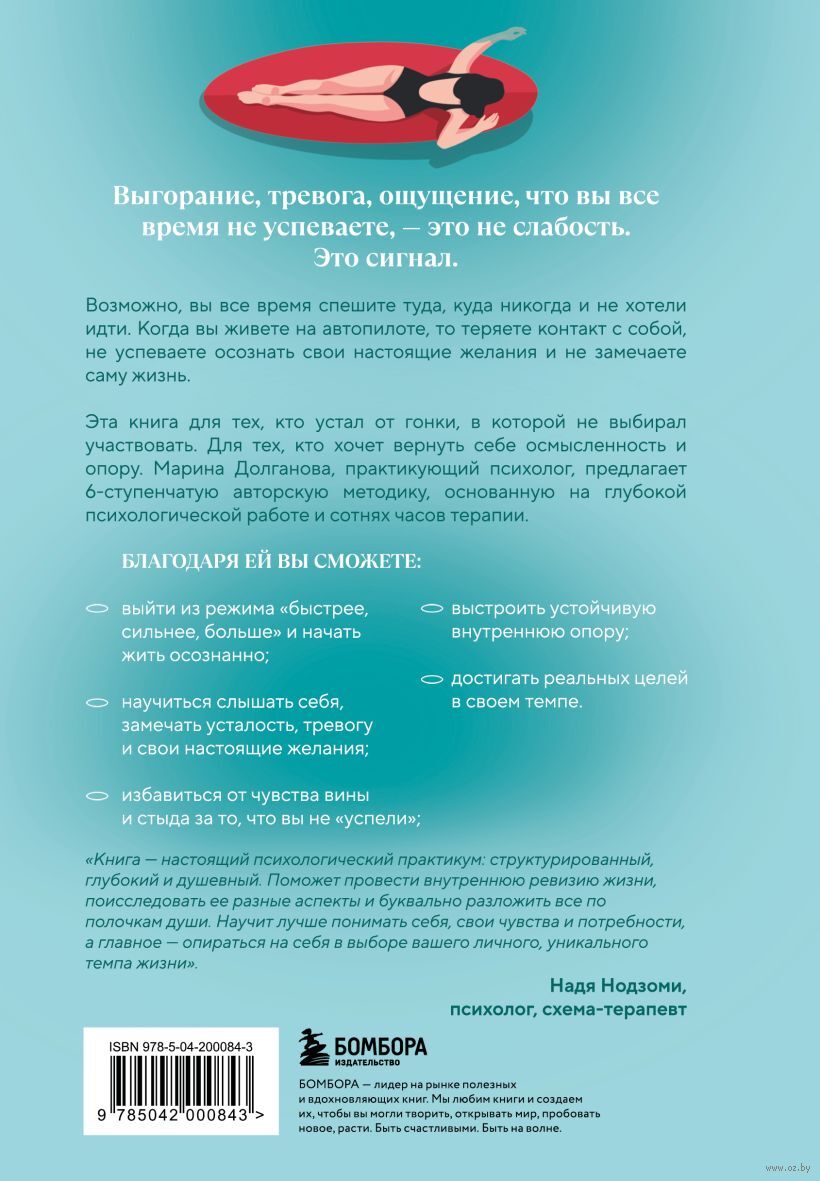 Эта книга – для тех, кто устал от гонки, в которой не выбирал участвовать. Для тех, кто хочет вернуть себе осмысленность и опору. Марина Долганова, практикующий психолог, предлагает 6-ступенчатную авторскую методику, основанную на глубокой психологической работе и сотнях часов терапии.