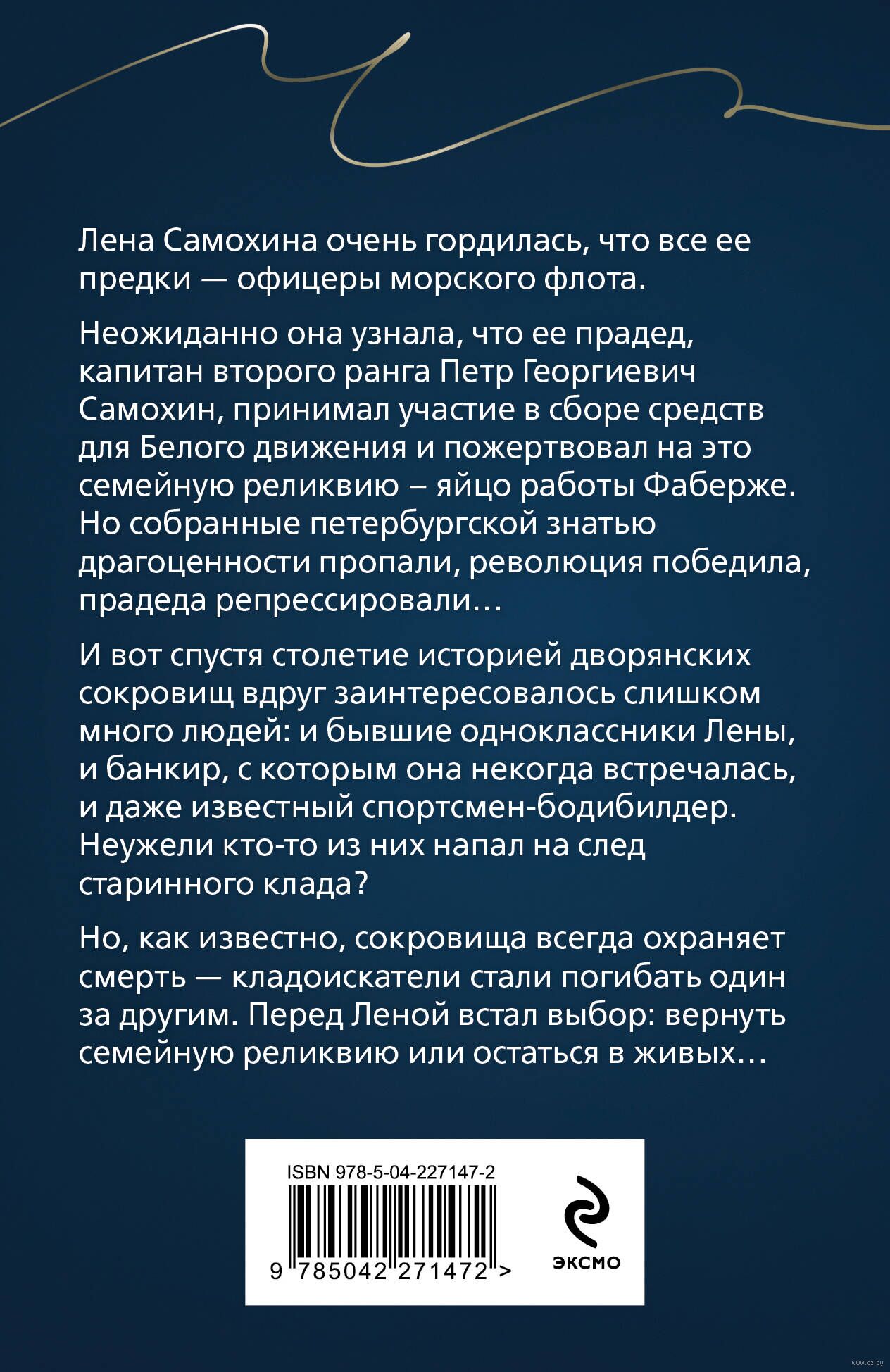 Лена Самохина очень гордилась, что все ее предки – офицеры морского флота. Неожиданно она узнала, что ее прадед, капитан второго ранга Петр Георгиевич Самохин, принимал участие в сборе средств для Белого движения и пожертвовал на это семейную реликвию – яйцо работы Фаберже. Но собранные петербургской знатью драгоценности пропали, революция победила, прадеда репрессировали… И вот спустя столетие историей дворянских сокровищ вдруг заинтересовалось слишком много людей: и бывшие одноклассники Лены, и банкир, с которым она некогда встречалась, и даже известный спортсмен-бодибилдер. Неужели кто-то из них напал на след старинного клада? Но, как известно, сокровища всегда охраняет смерть – кладоискатели стали погибать один за другим. Перед Леной встал выбор: вернуть семейную реликвию или остаться в живых…