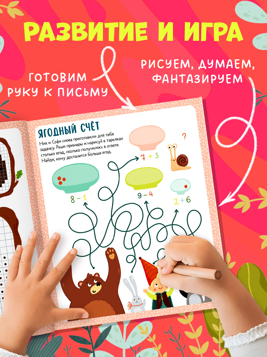 Маленькому следопыту, гуляя по лесу вместе с героями Ником и Софи, а также их друзьями – совой Клавой и улиткой Людвигом – нужно будет искать отличия на страницах книги, соединять точки, искать выходы из лабиринтов, распутывать путаницы, раскрашивать, рисовать, обводить.