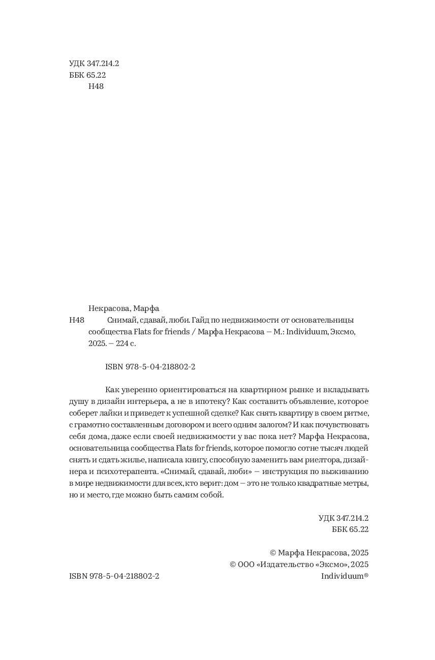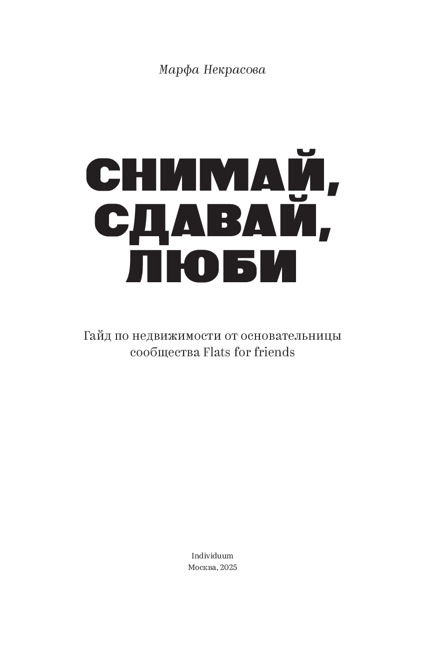 Как уверенно ориентироваться на квартирном рынке и вкладывать душу в дизайн интерьера, а не в ипотеку? Как составить объявление, которое соберет лайки и приведет к успешной сделке? Как снять квартиру в своем ритме, с грамотно составленным договором и всего одним залогом? И как почувствовать себя дома, даже если своей недвижимости у вас пока нет? Марфа Некрасова, основательница сообщества Flats for friends, которое помогло сотне тысяч людей снять и сдать жилье, написала книгу, способную заменить вам риелтора, дизайнера и психотерапевта. "Снимай, сдавай, люби" – инструкция по выживанию в мире недвижимости для всех, кто верит: дом – это не только квадратные метры, но и место, где можно быть самим собой.