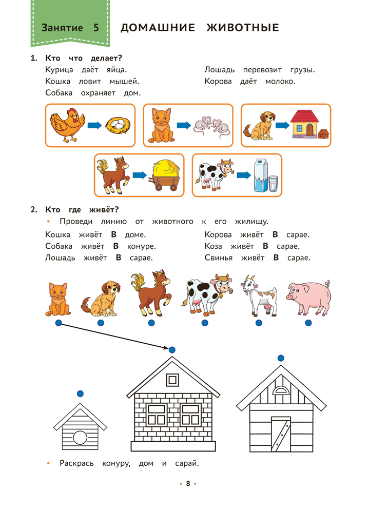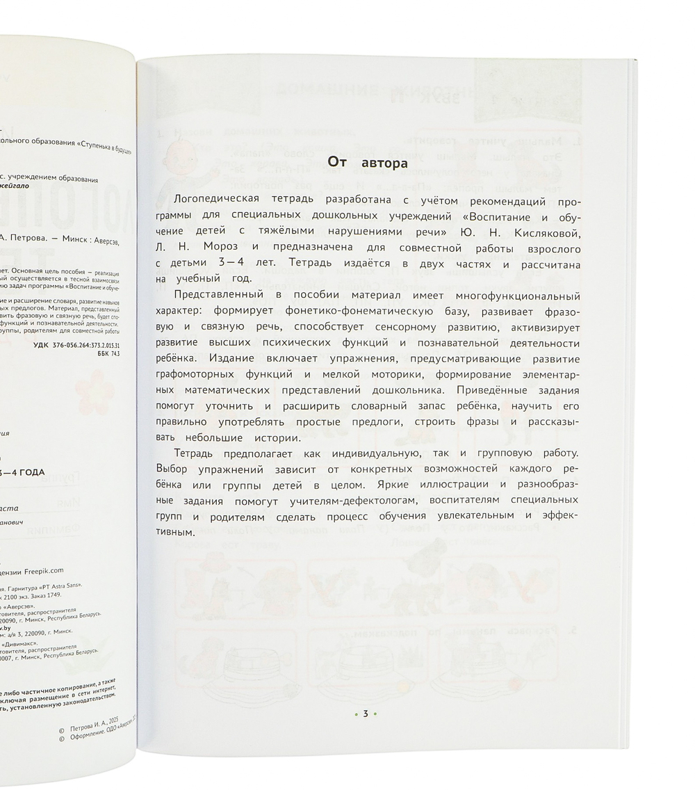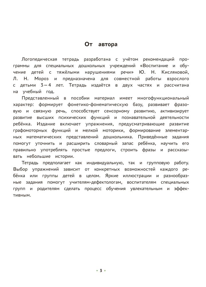 Предложенные в пособии упражнения и игры направлены на уточнение и расширение словаря, развитие навыков словоизменения и словообразования, правильного употребления простых предлогов. Материал, представленный в тетради, поможет сформировать фонетико-фонематическую базу, развить фразовую и связную речь, будет способствовать сенсорному развитию, активизации высших психических функций и познавательной деятельности.