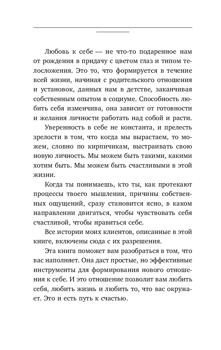 Красота в глазах смотрящего. Но что, если в своем отражении вы видите только недостатки? Если нелюбовь к себе стала вашим верным, но изматывающим спутником, эта книга – ваш шанс вырваться из этого замкнутого круга. Встать на путь любви к себе непросто, но это необходимо, чтобы обрести счастье.