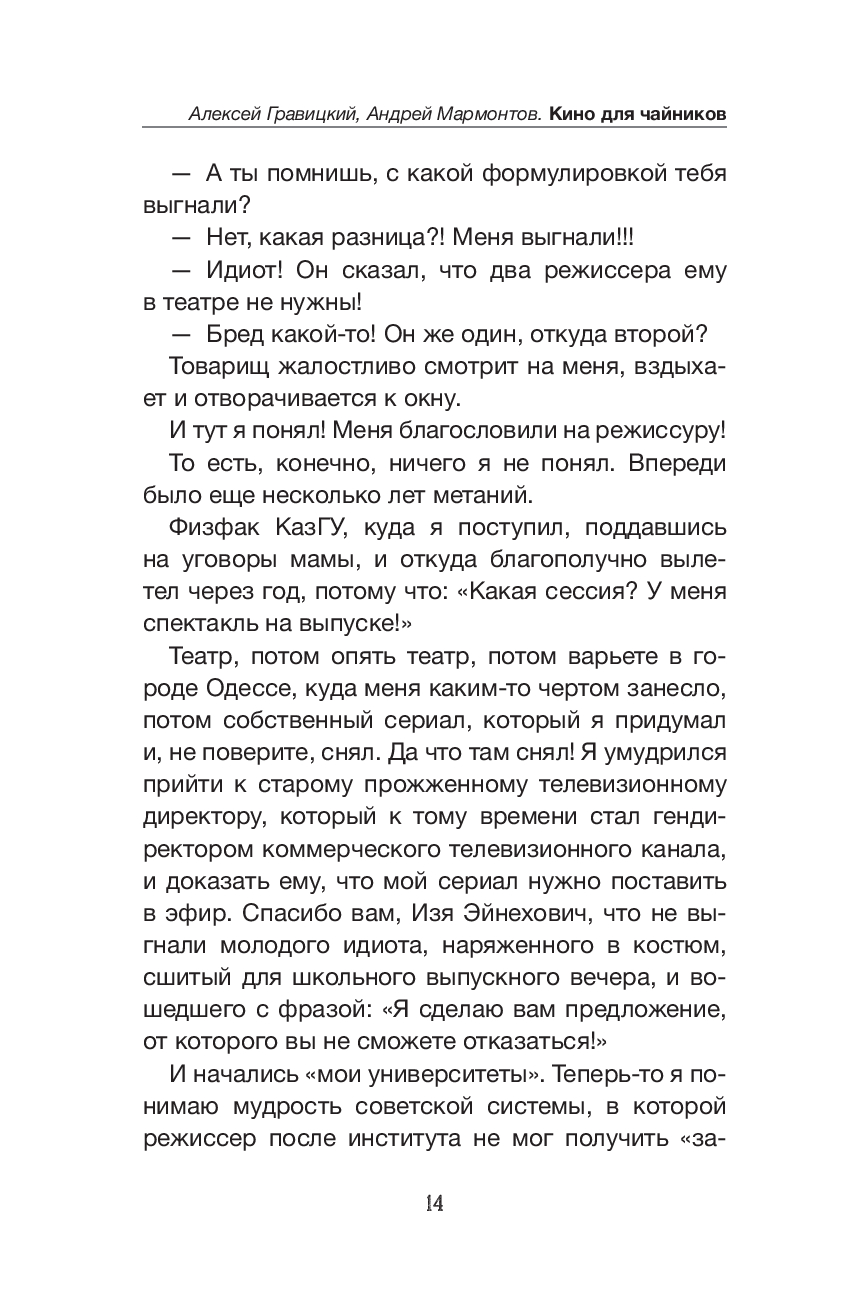 "Кино для чайников" – практичное и остроумное руководство для тех, кто хочет попасть в киноиндустрию. Сценарист Алексей Гравицкий и режиссер Андрей Мармонтов делятся личным опытом, раскрывая секреты профессии: как начать карьеру, избежать ошибок, работать с продюсерами и не дать испортить свой сценарий.