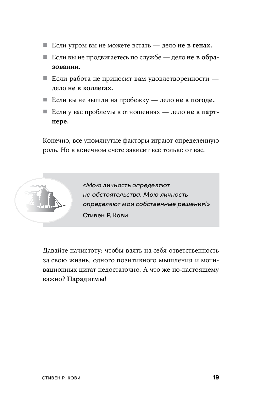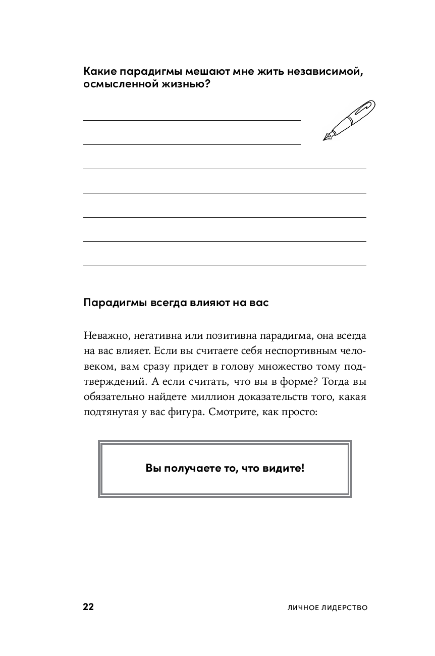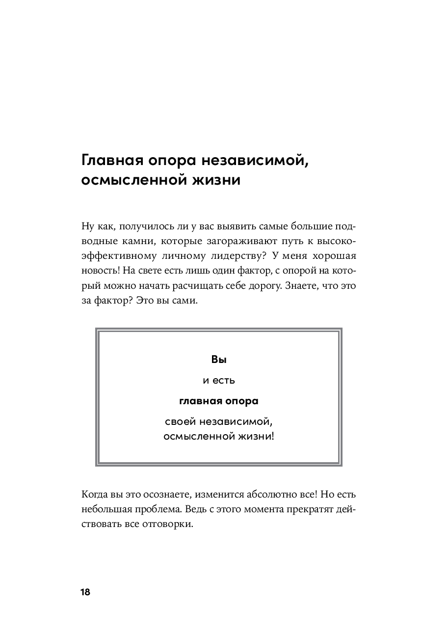 Если вы хотите жить независимой и осмысленной жизнью в мире, полном сложностей, суеты и проблем, вам необходимо научиться личному лидерству: сделать так, чтобы вами управляли не обстоятельства, а ваши собственные решения. Но как этого добиться? Как минимизировать влияние чужих планов, следовать внутреннему голосу и воплощать мечты? Ответы вы найдете в книге Стивена Р. Кови, автора мирового бестселлера "Семь навыков высокоэффективных людей". Сформулированные им принципы помогли миллионам читателей обрести личное счастье и профессиональный успех. Тесты, чек-листы, опросники, упражнения и советы придадут вам смелости проложить свой курс, добиваться целей и жить той жизнью, о которой вы всегда мечтали.