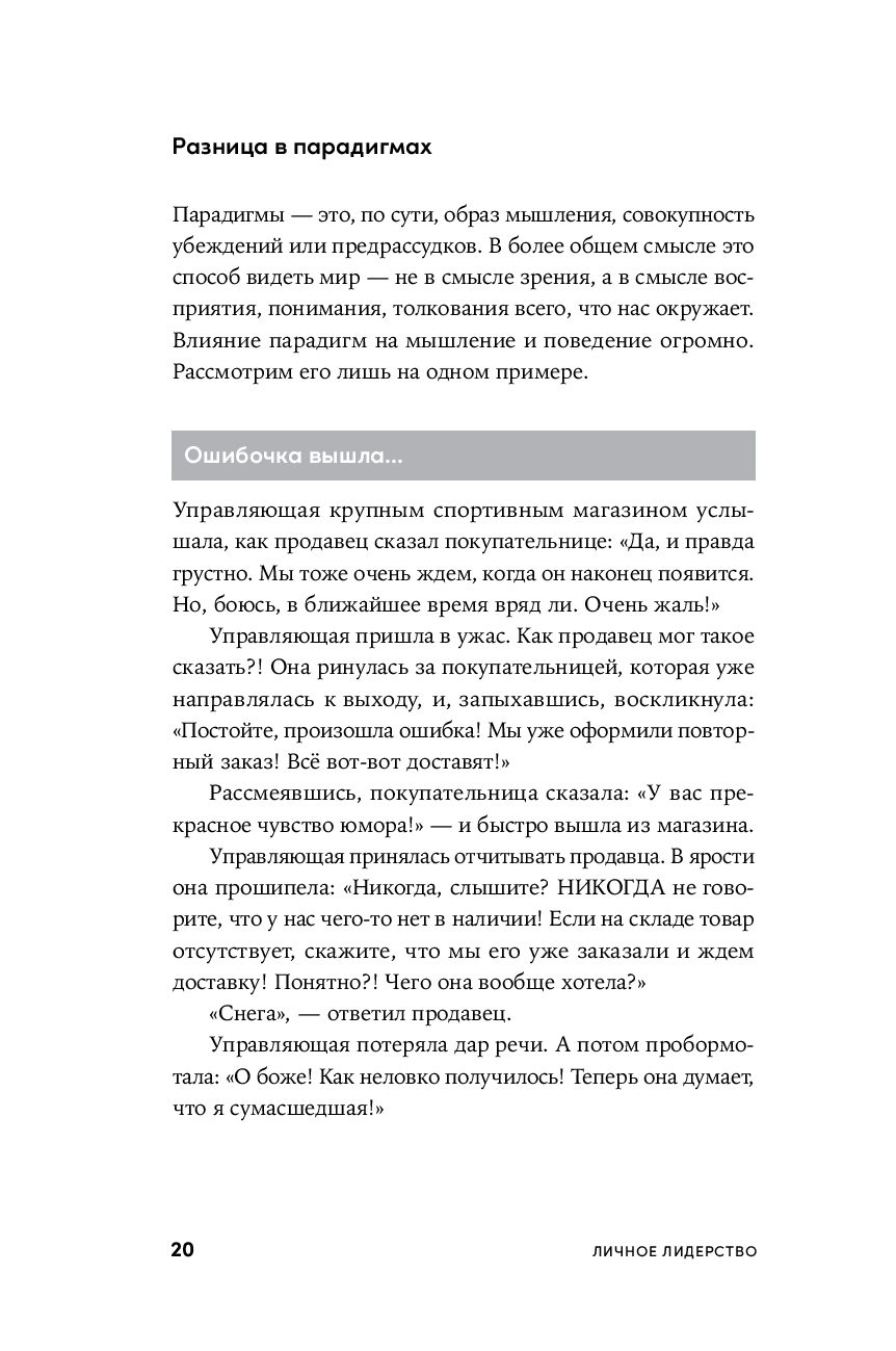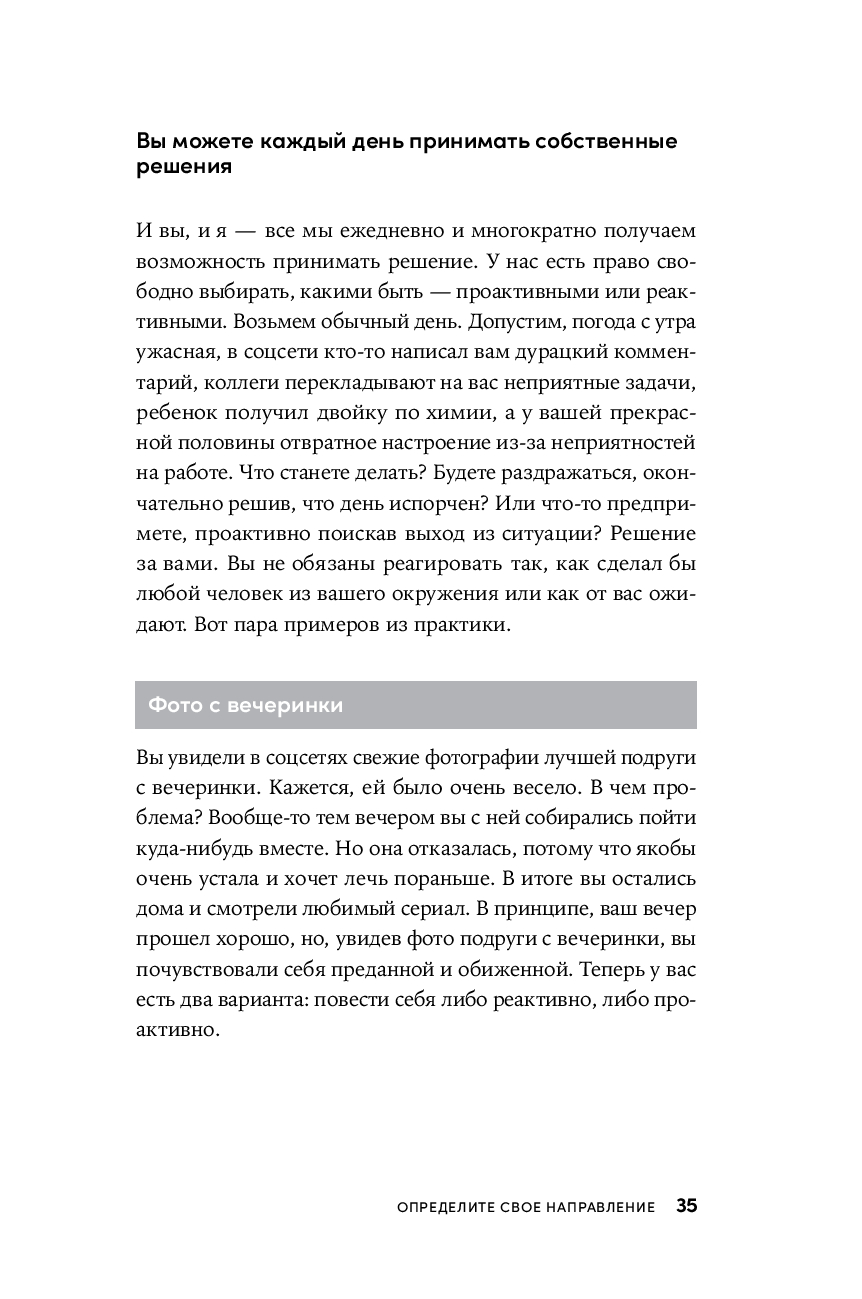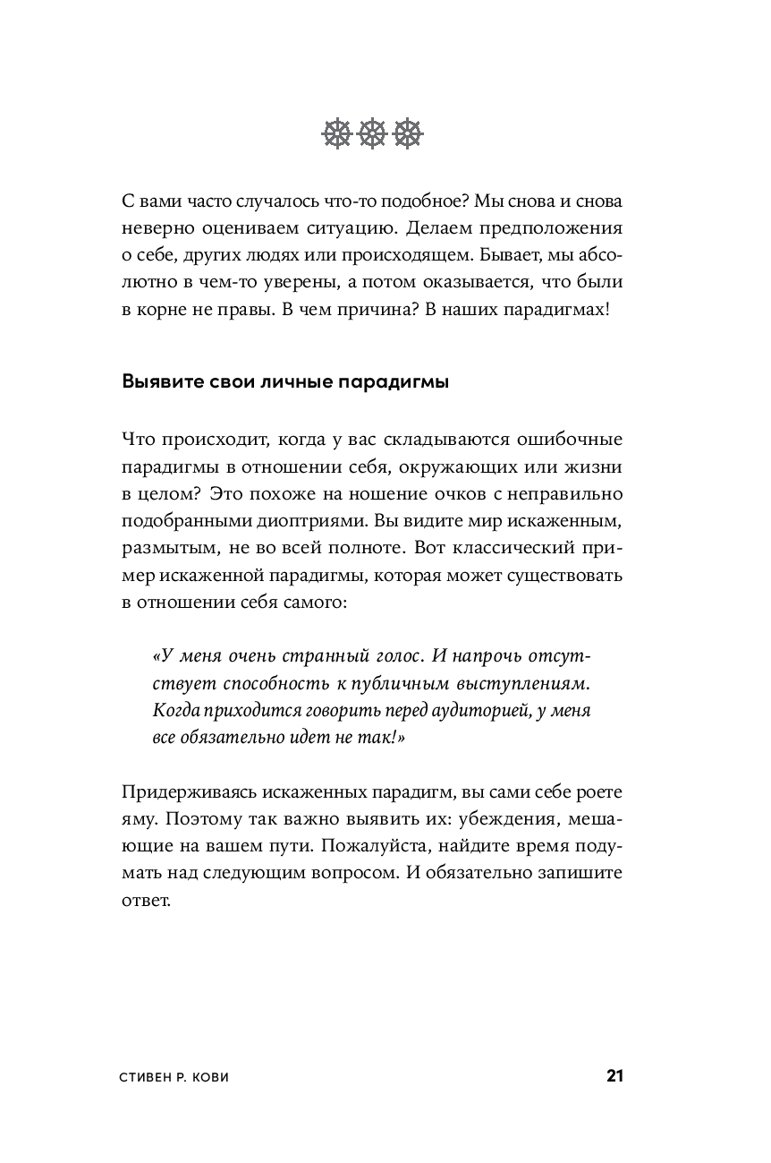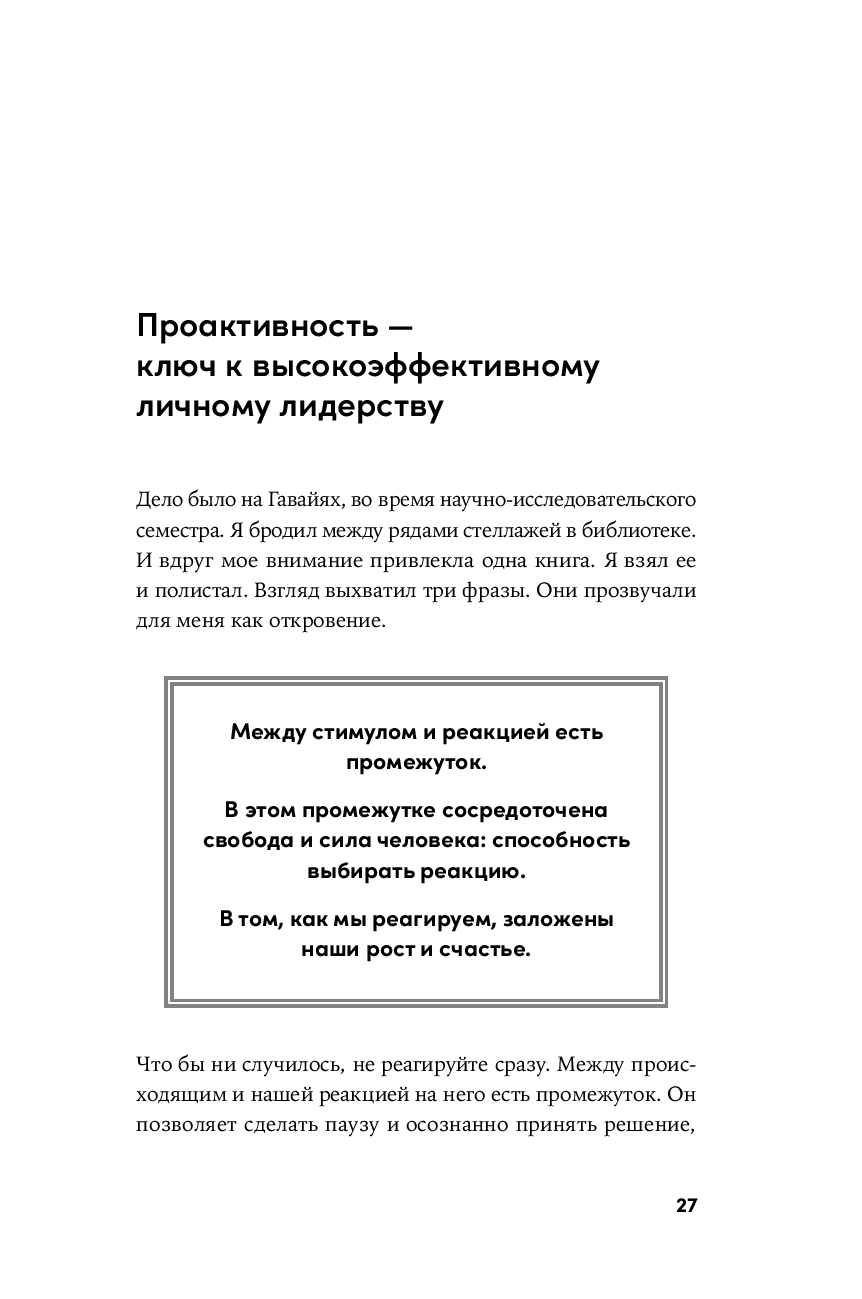 Если вы хотите жить независимой и осмысленной жизнью в мире, полном сложностей, суеты и проблем, вам необходимо научиться личному лидерству: сделать так, чтобы вами управляли не обстоятельства, а ваши собственные решения. Но как этого добиться? Как минимизировать влияние чужих планов, следовать внутреннему голосу и воплощать мечты? Ответы вы найдете в книге Стивена Р. Кови, автора мирового бестселлера "Семь навыков высокоэффективных людей". Сформулированные им принципы помогли миллионам читателей обрести личное счастье и профессиональный успех. Тесты, чек-листы, опросники, упражнения и советы придадут вам смелости проложить свой курс, добиваться целей и жить той жизнью, о которой вы всегда мечтали.