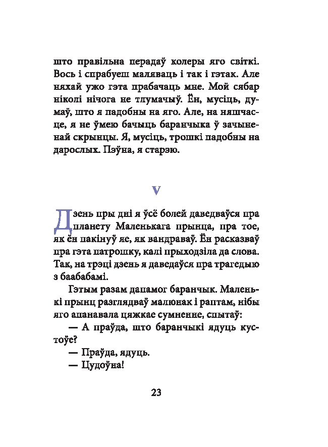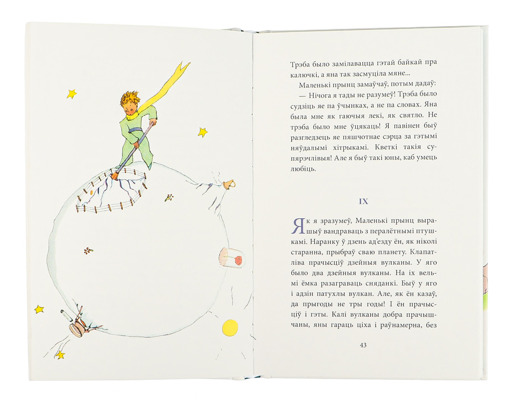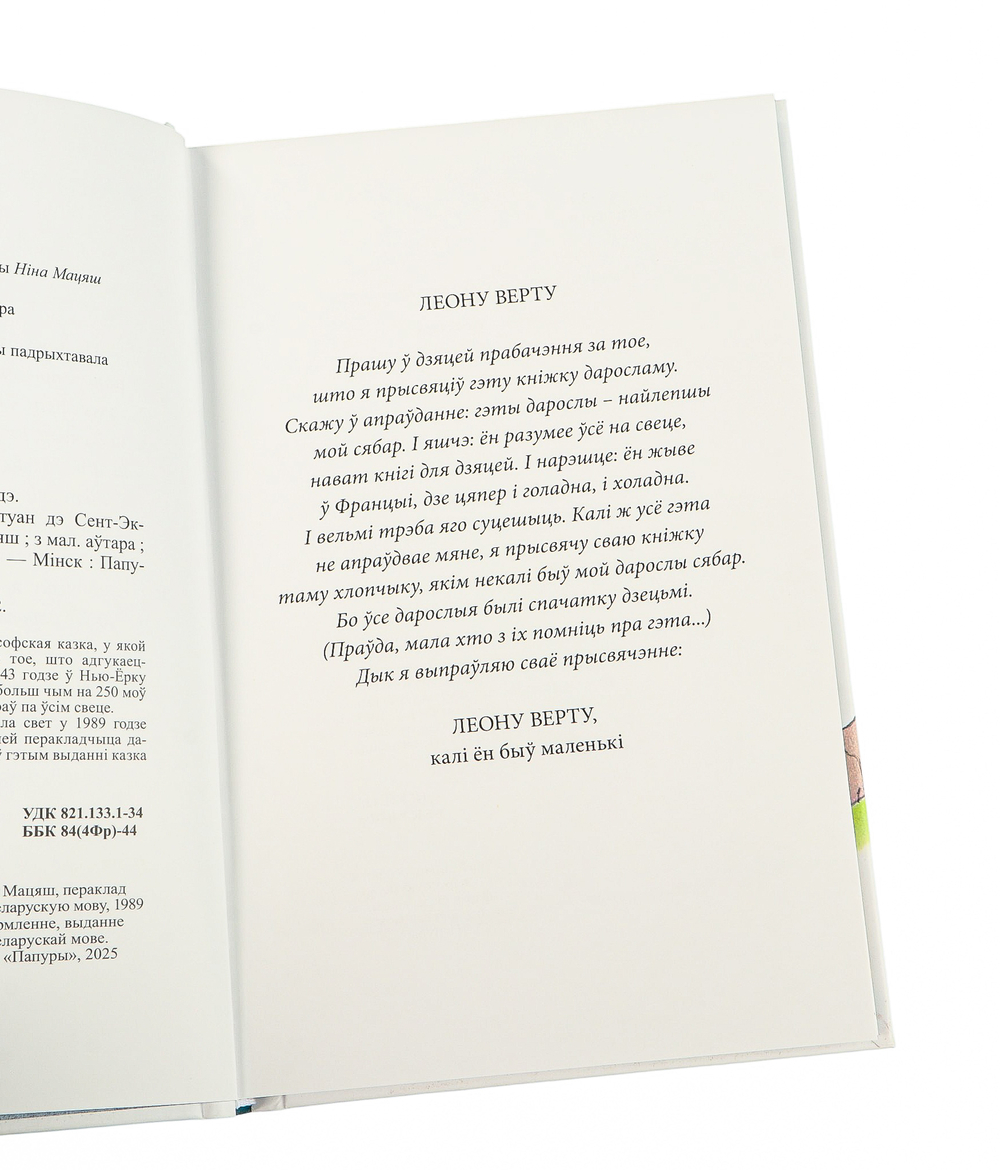 "Маленькі прынц" – філасофская казка, у якой чытач любога ўзросту знойдзе тое, што адгукаецца яго душы. Яна выйшла ў 1943 годзе ў Нью-Ёрку і з таго часу была перакладзена больш чым на 250 моў і выдадзена мільёнамі экзэмпляраў па ўсім свеце. На беларускай мове пабачыла свет у 1989 годзе ў перакладзе Ніны Мацяш. Пазней перакладчыца дапрацоўвала і рэдагавала тэкст, і ў гэтым выданні казка друкуецца з яе праўкамі.