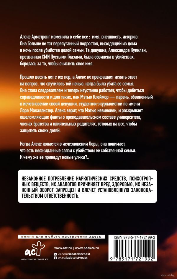 Алекс Армстронг изменила в себе все : имя, внешность, историю. Она больше не тот перепуганный подросток, выходящий из дома в ночь после убийства целой семьи. Та девушка, Александра Куинлан, прозванная СМИ Пустыми Глазами, была обвинена в убийствах, боролась за то, чтобы очистить свое имя.