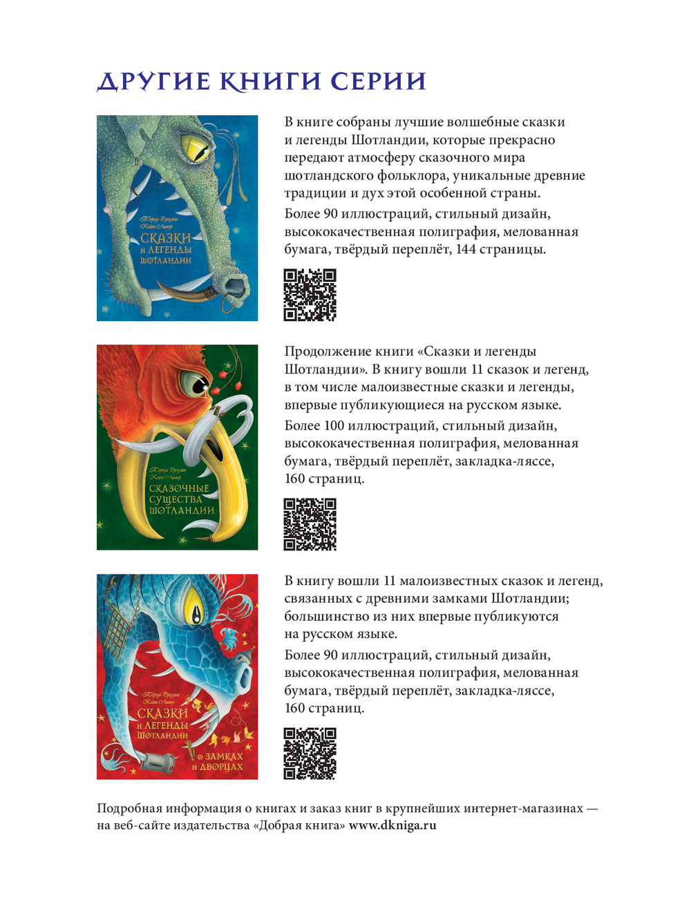 В этой книге, ставшей продолжением бестселлеров "Сказки и легенды Шотландии" и "Сказочные существа Шотландии" и "Сказки и легенды Шотландии о замках и дворцах", собраны 10 увлекательных сказок и легенд о драконах из Шотландии, Польши, Греции, Египта, России, Индии, Китая, Японии, Центральной Америки и Скандинавии в пересказе Терезы Бреслин – всемирно известной детской писательницы и лауреата Медали Карнеги, престижной литературной премии за лучшую детскую книгу.