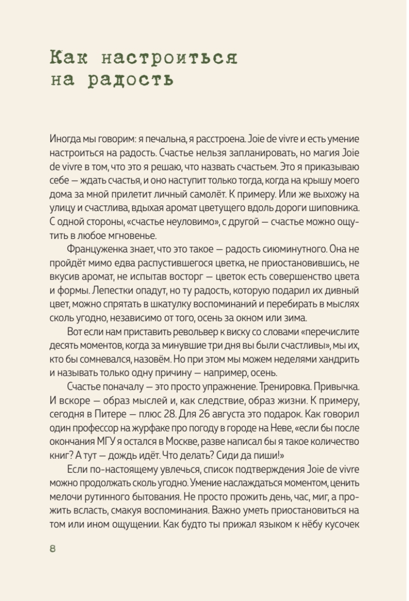 "В Петербурге время чая. Искусство наслаждаться жизнью каждый день" об особом умении французов радоваться «мелочам», об их даре создавать невероятные эмоции и воспоминания, которые остаются в памяти навсегда: "Joie de vivre" – радость жизни.