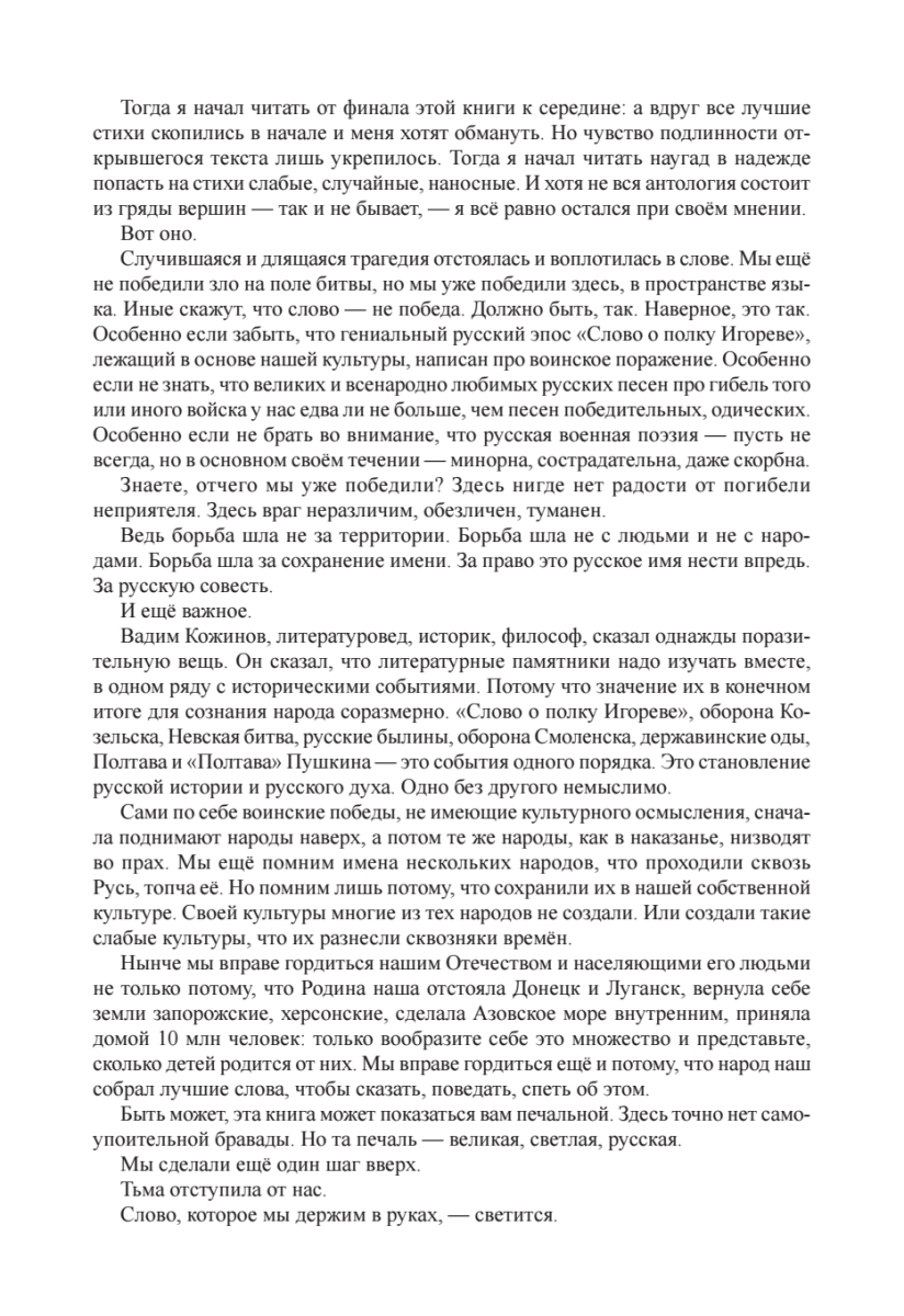 "...Нынче мы вправе гордиться нашим Отечеством и населяющими его людьми не только потому, что Родина наша отстояла Донецк и Луганск, вернула себе земли запорожские, херсонские, сделала Азовское море внутренним, приняла домой 10 млн человек: только вообразите себе это множество и представьте, сколько детей родится от них. Мы вправе гордиться ещё и потому, что народ наш собрал лучшие слова, чтобы сказать, поведать, спеть об этом.