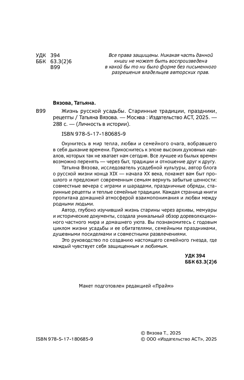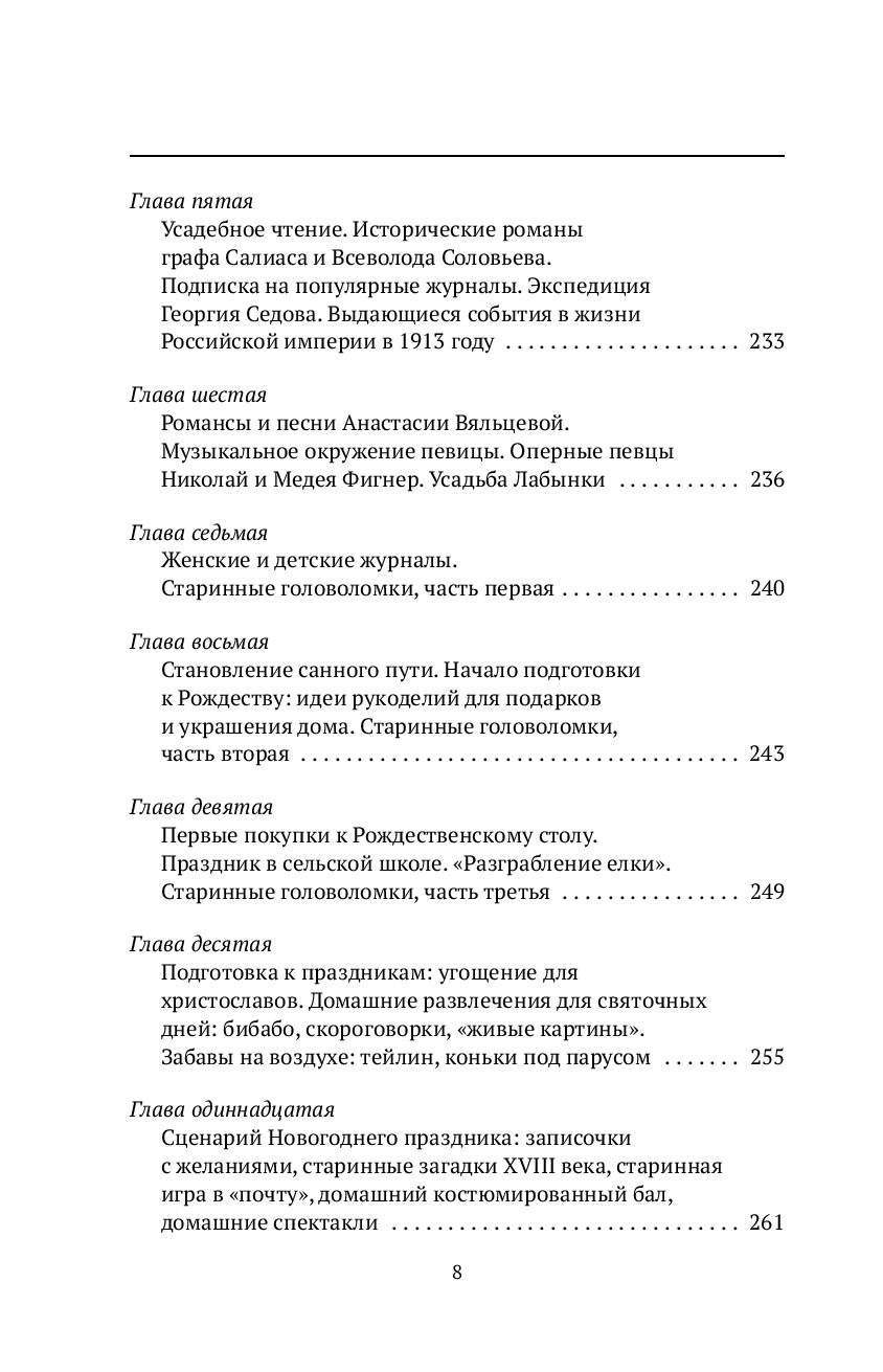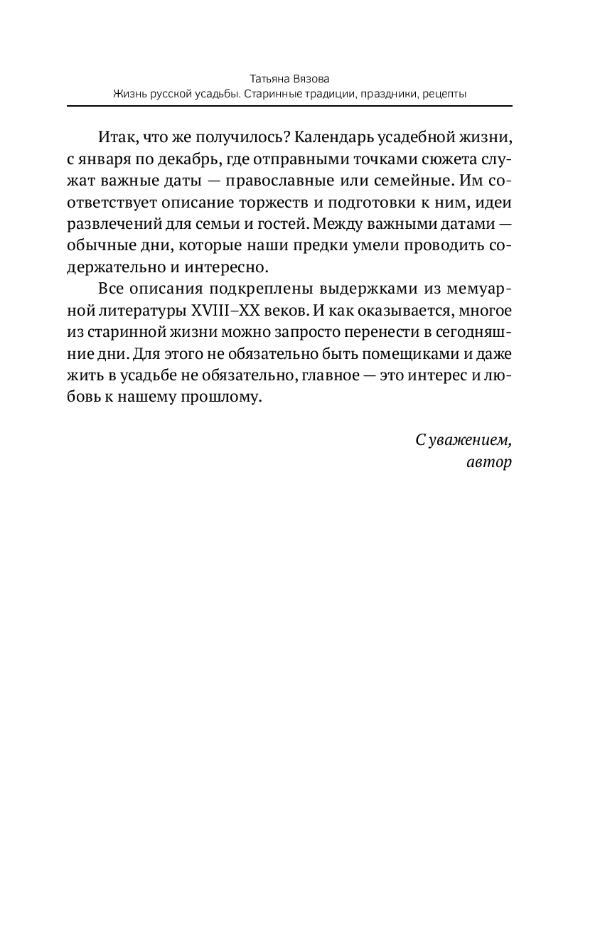 На страницах книги вас ждет увлекательное погружение в семейную историю, которая раскрывает год жизни в русской усадьбе. Вы ощутите атмосферу домашнего уюта, хлебосольных праздников, традиций и примет ушедшей эпохи. Татьяна Вязова оживляет музейные экспонаты и предлагает читателям вернуть в свою жизнь утраченное: календарь праздников, традиционные игры, шарады, загадки и рецепты, адаптированные для современных условий.