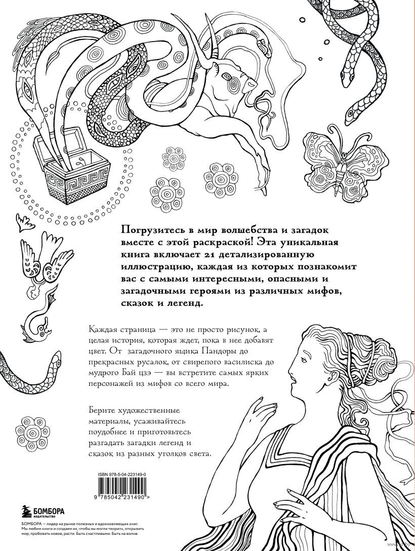 На страницах этой раскраски собраны самые удивительные мифы и сказки со всех концов света – от Греции до Японии. Под одной обложкой собрана 21 история разных народов мира, каждая из которых сопровождается детализированной иллюстрацией. Вместе с раскраской вы познакомитесь с принцем-крабом, откроете ящик Пандоры, сможете загадать желание настоящему джинну. На творческом пути вам встретится Чудо-юдо рыба кит, русалки и другие уникальные персонажи. Устраивайтесь поудобнее, берите любимые художественные материалы и отправьтесь в путешествие по сказкам и легендам всего мира.
