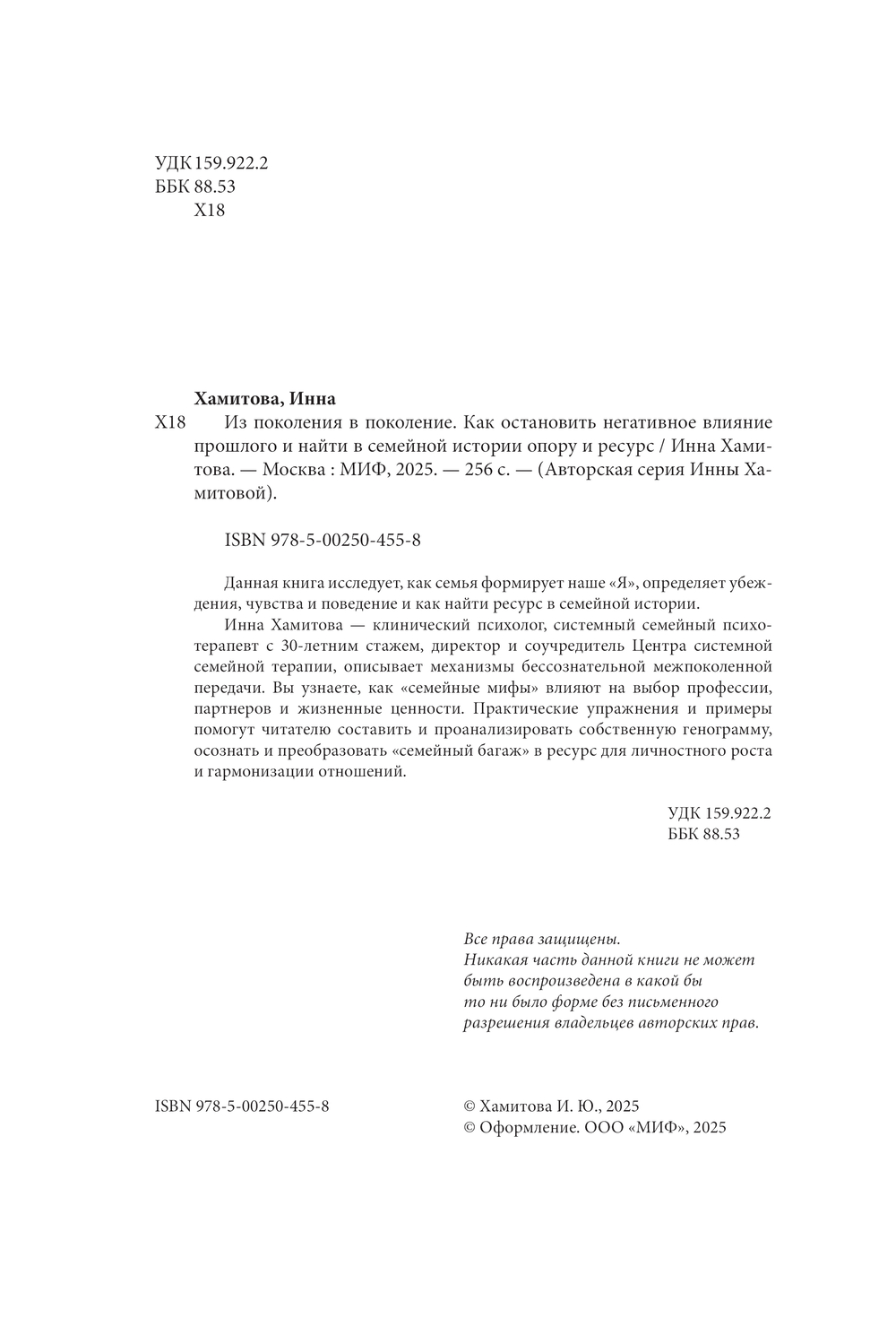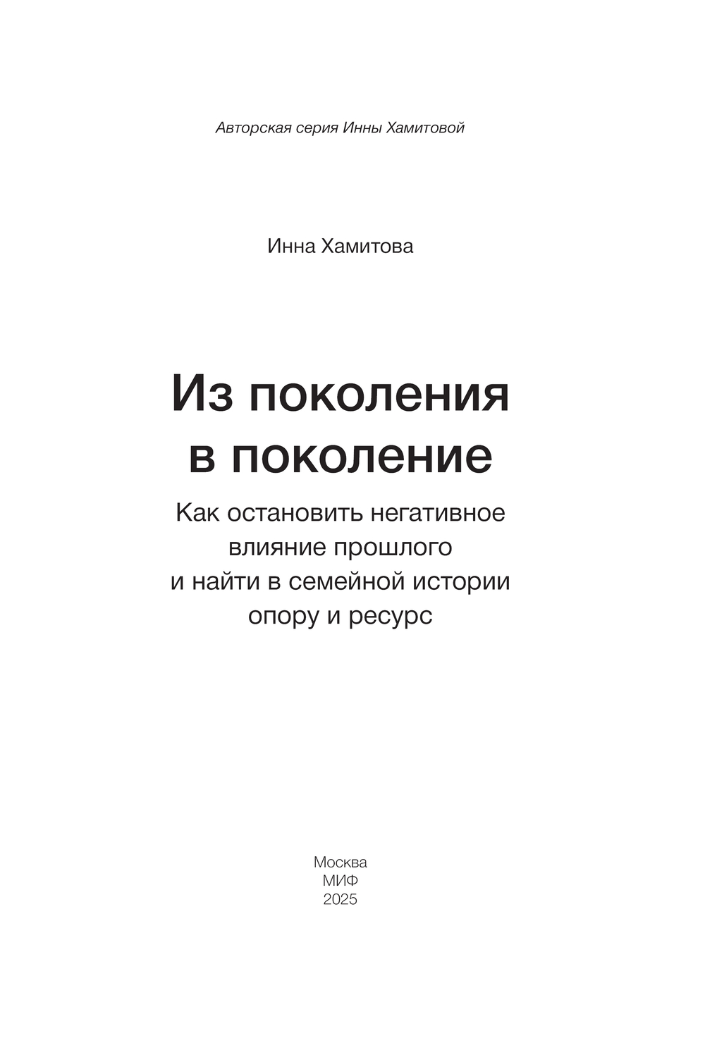 Инна Хамитова – клинический психолог и системный семейный психотерапевт с тридцатилетним стажем, директор Центра системной семейной терапии. В этой книге она показывает, как повторяющиеся конфликты, скрытые семейные мифы, неосознаваемые установки передаются из поколения в поколение и влияют на текущую жизнь: отношения, выбор профессии, финансы, мировоззрение и не только.