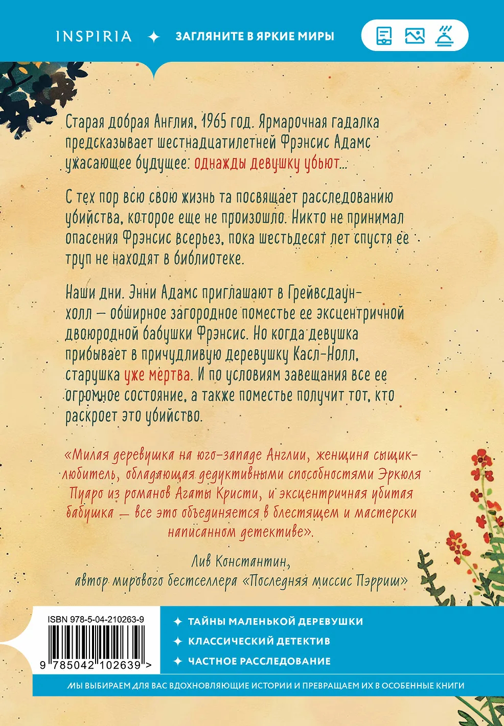 Старая добрая Англия, 1965 год. Ярмарочная гадалка предсказывает шестнадцатилетней Фрэнсис Адамс ужасающее будущее: однажды девушку убьют… С тех пор всю свою жизнь та посвящает расследованию убийства, которое еще не произошло. Никто не принимал опасения Фрэнсис в серьез, пока, шестьдесят лет спустя, ее труп не находят в библиотеке.