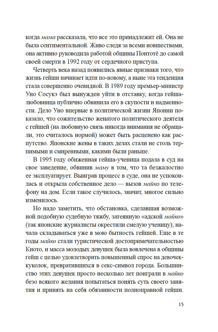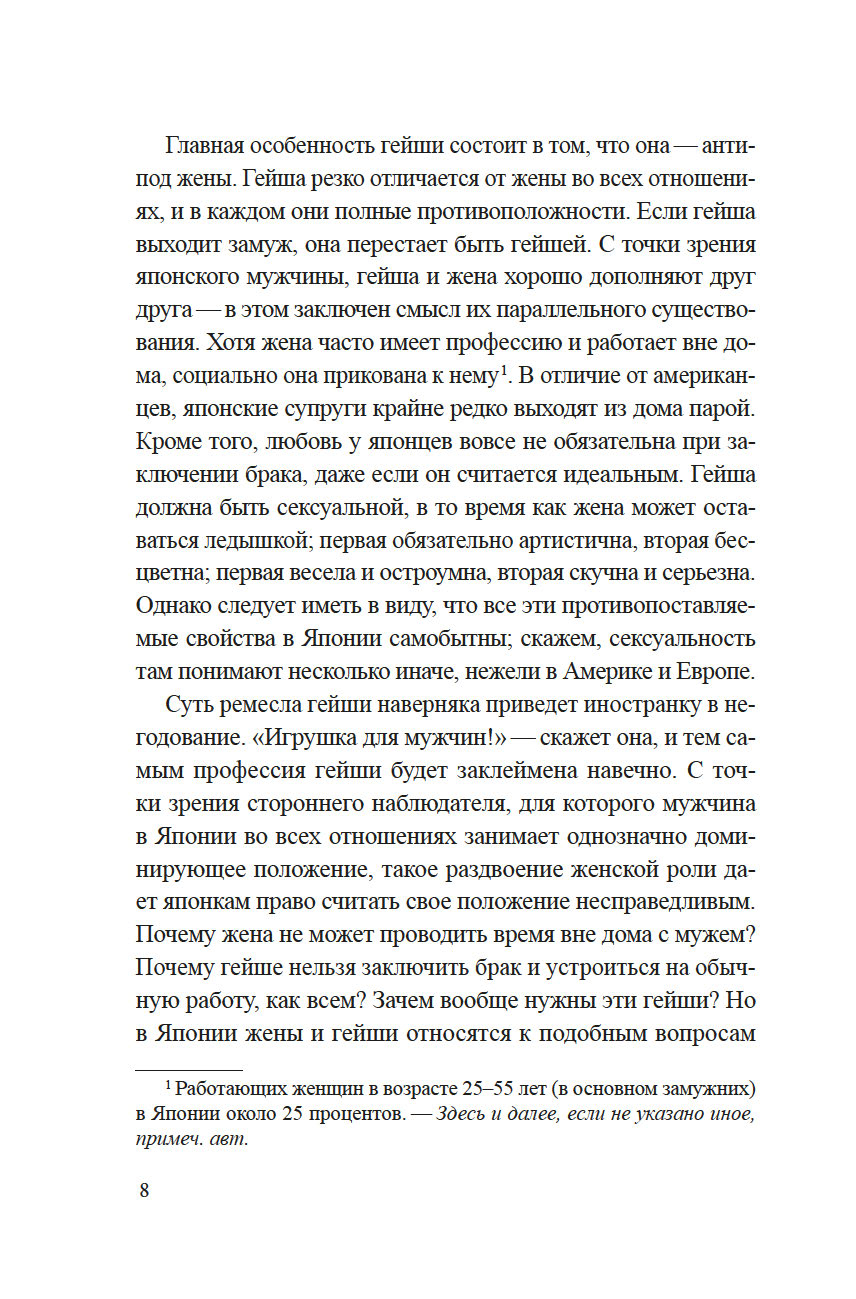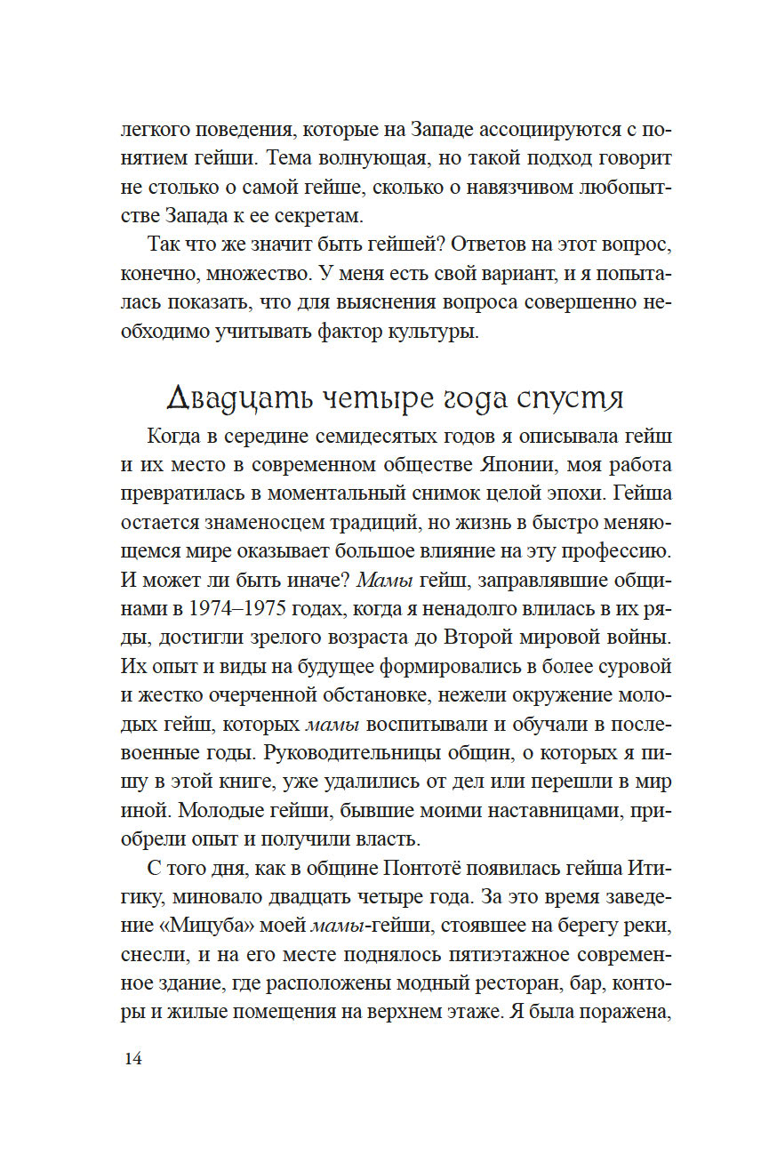 Лиза Дэлби – первая в мире неяпонка, работавшая гейшей, – провела уникальное исследование загадочного и закрытого для чужаков мира изящества, красоты и традиций, который с давних времен очаровывал и увлекал Запад. Приглашая нас в самое сердце спрятанного от посторонних глаз сообщества, Дэлби подробно описывает реальную жизнь гейш, открывая нам глаза на древнюю профессию, которая продолжает выживать в современной Японии. Сегодня гейши обеспечили себе достойное место в обществе, совершив переход от законодателей моды к хранителям культурного наследия, но идеал женского очарования в сочетании с традиционным искусством, который представляет собой образ гейши, по-прежнему глубоко укоренен в Японии и вызывает восхищение всего мира.