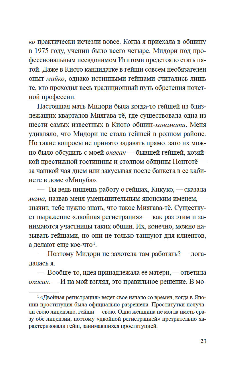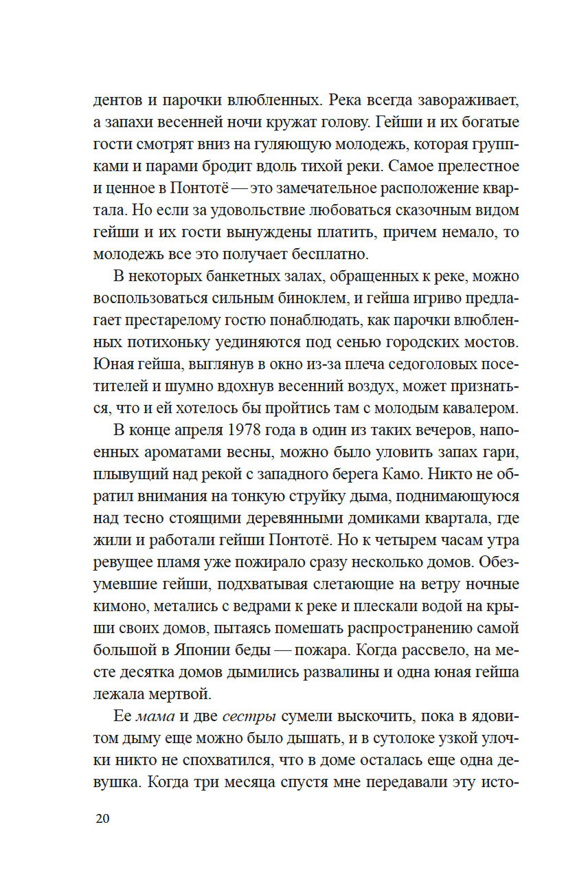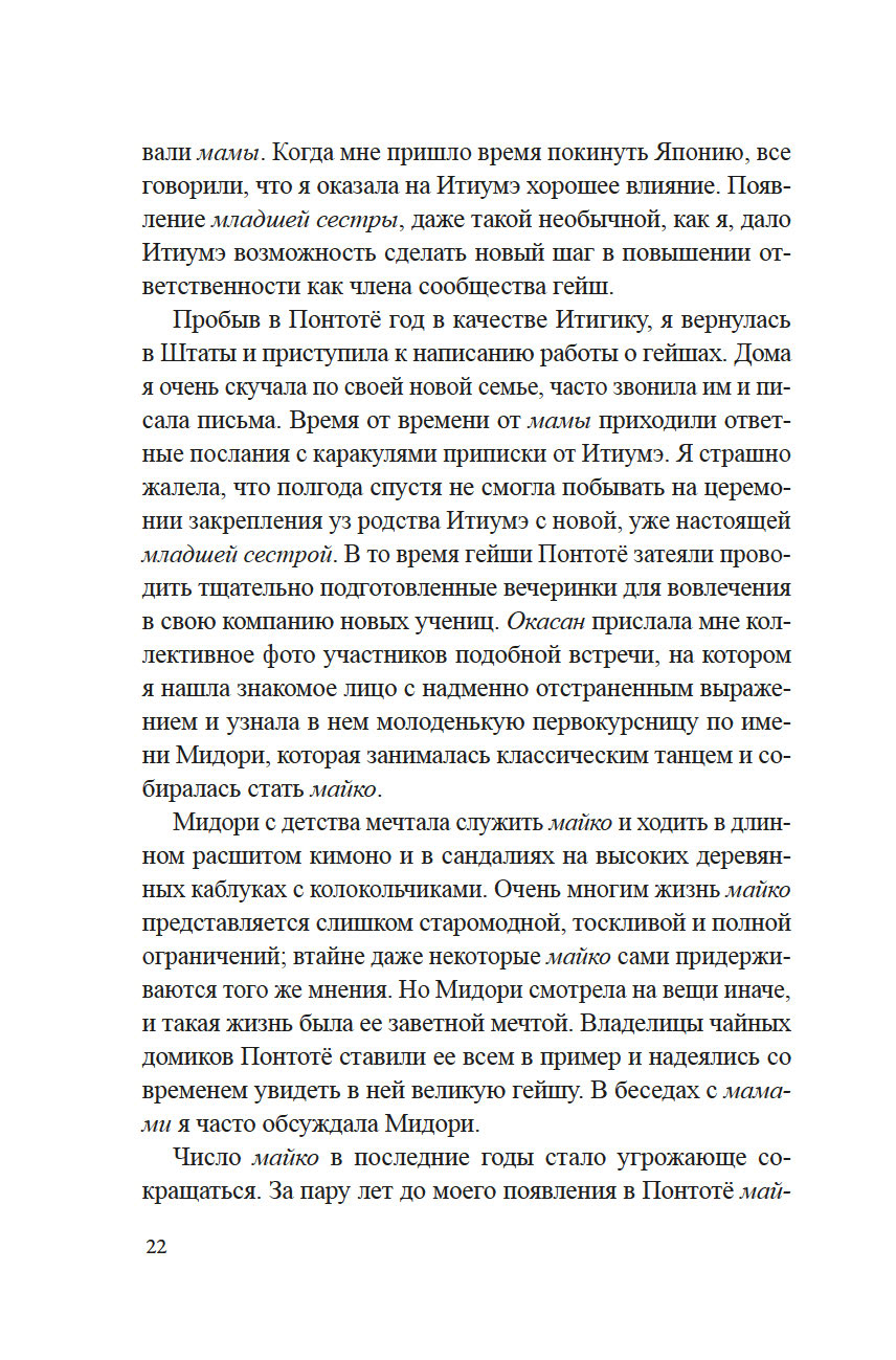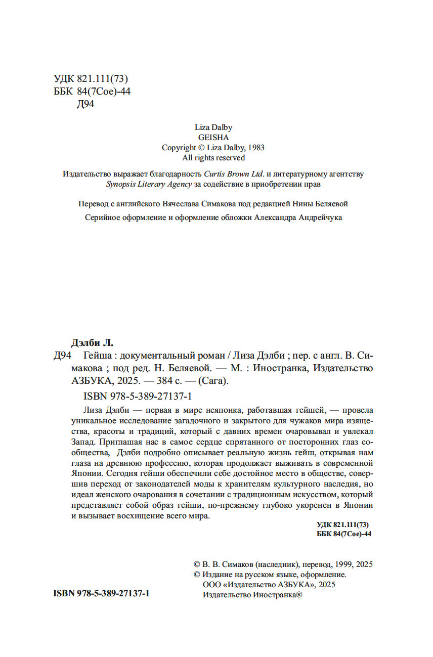 Лиза Дэлби – первая в мире неяпонка, работавшая гейшей, – провела уникальное исследование загадочного и закрытого для чужаков мира изящества, красоты и традиций, который с давних времен очаровывал и увлекал Запад. Приглашая нас в самое сердце спрятанного от посторонних глаз сообщества, Дэлби подробно описывает реальную жизнь гейш, открывая нам глаза на древнюю профессию, которая продолжает выживать в современной Японии. Сегодня гейши обеспечили себе достойное место в обществе, совершив переход от законодателей моды к хранителям культурного наследия, но идеал женского очарования в сочетании с традиционным искусством, который представляет собой образ гейши, по-прежнему глубоко укоренен в Японии и вызывает восхищение всего мира.