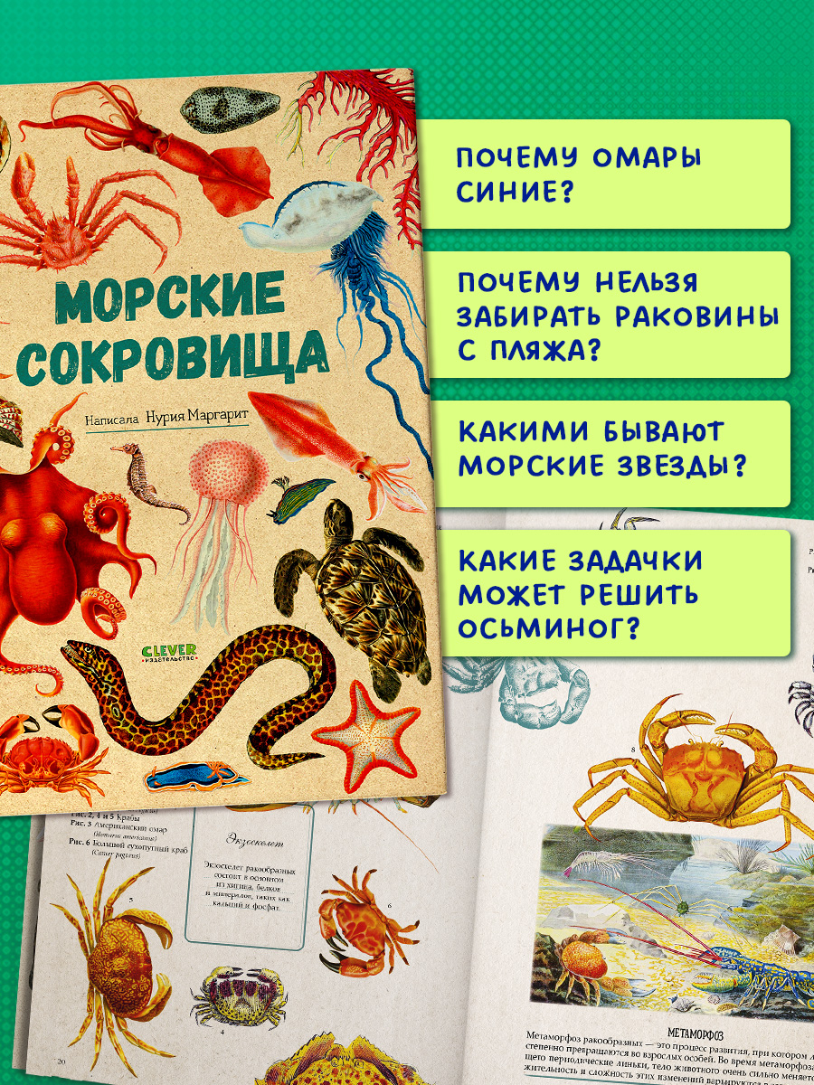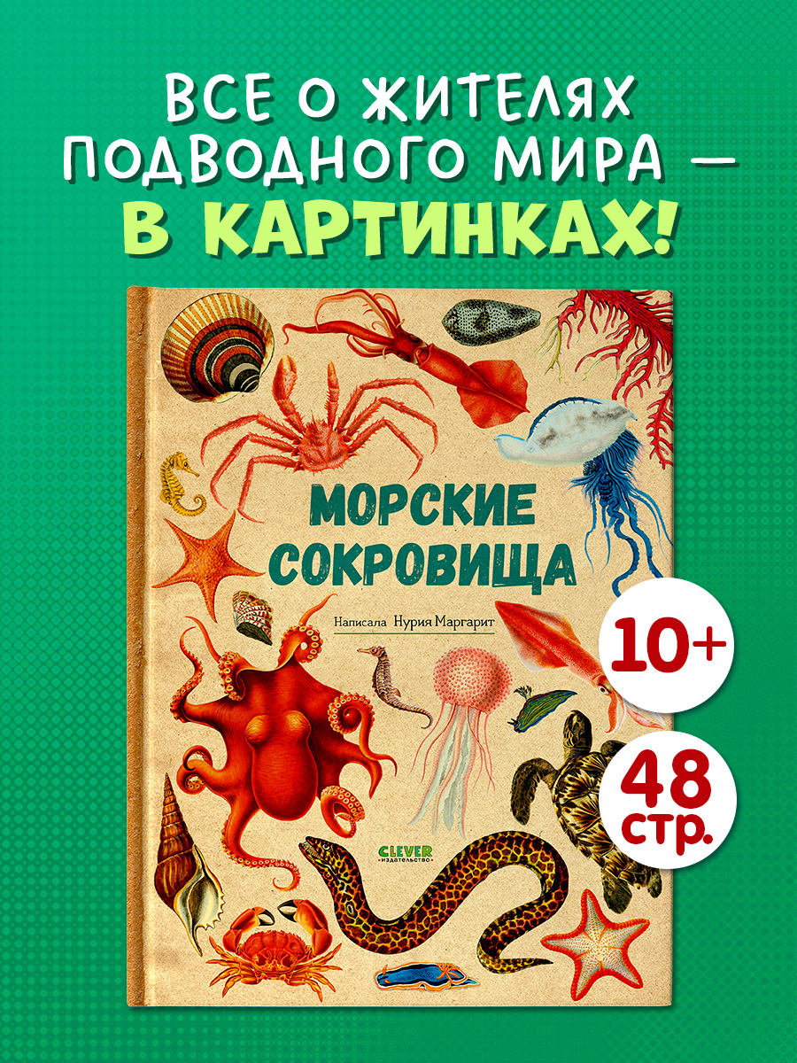 Научные названия – на русском и латыни. Детская энциклопедия "Морские сокровища" – отличный подарок девочке и мальчику 10 лет и удачный выбор для родителей, которые ищут книги для детей о морских жителях, интересные книги в помощь школьникам на уроках биологии, книги для детей 10 лет и Clever книги с красивыми иллюстрациями.
