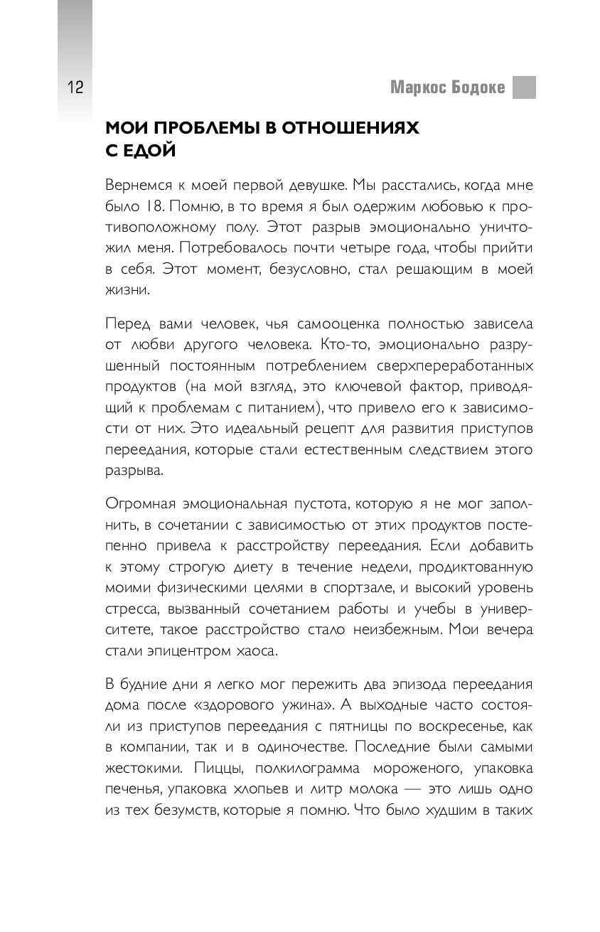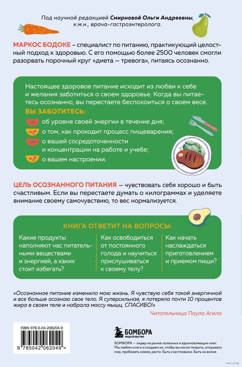 Как научиться прислушиваться к своему телу и выбирать по-настоящему здоровое питание? Специалист по осознанному питанию Маркос Бодоке выделит продукты, приносящие пользу, и продукты, которые разрушают здоровье. Автор расскажет, что на проблему похудения нужно смотреть целостно, и осознанное питание – лучший навигатор для этого.