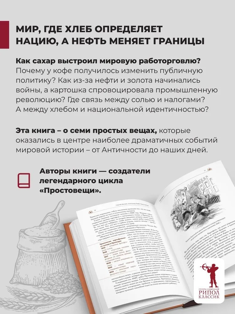 "Простовещи. История мира через легендарные товары и любимые продукты". Как сахар выстроил мировую работорговлю? Почему у кофе получилось изменить публичную политику? Как из-за нефти и золота начинались войны, а картошка спровоцировала промышленную революцию? Где связь между солью и налогами? А между хлебом и национальной идентичностью?