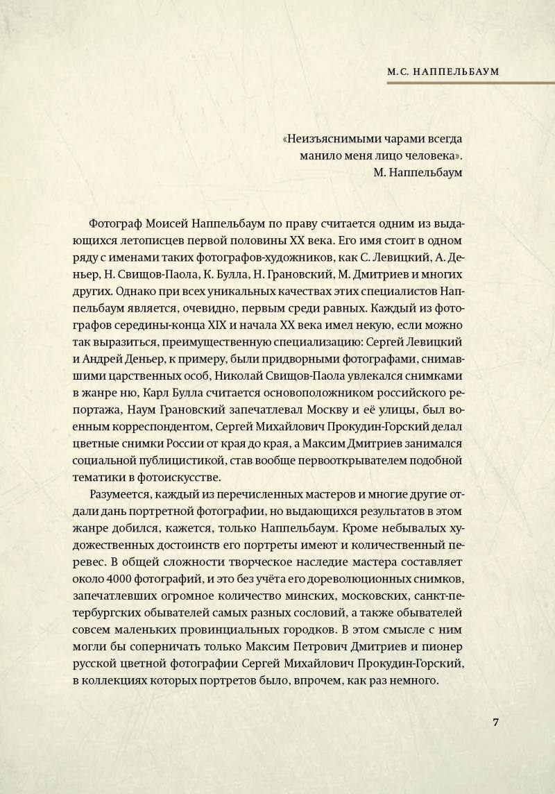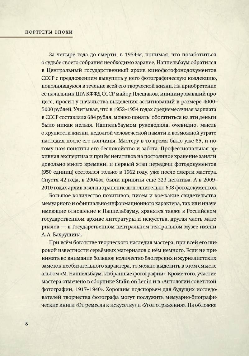 Наппельбаум, "первый среди равных", создал более 4000 снимков, сочетая классическую композицию с авангардными приёмами, а его "рембрандтовский свет" придавал портретам драматизм и художественную завершённость. Альбом раскрывает не только творчество мастера, но и его личность, сложную судьбу наследия Наппельбаума. Особое внимание уделено редким материалам: мемуарам дочери Иды, автобиографии "От ремесла к искусству" и ранее не публиковавшимся негативам.