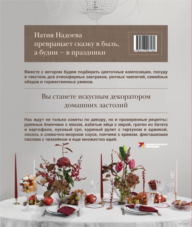 Художник Натия Надоева превращает сказку в быль, а будни – в праздники. Вместе с автором будем подбирать идеальные цветочные композиции, гармоничную посуду и текстиль для атмосферных застолий, уютных чаепитий, семейных обедов и торжественных ужинов. Вы станете искусным декоратором домашних застолий. И поймете, что вполне можно обойтись без лишних финансовых затрат. Красота пространства и момента зависит только от вашего желания и знания секретов композиции, которыми щедро делится автор.