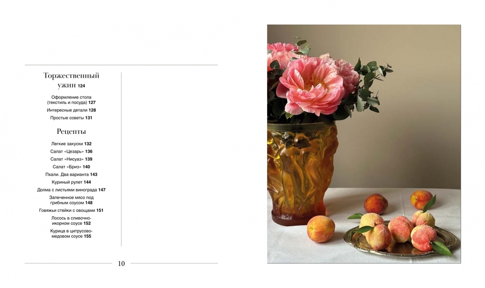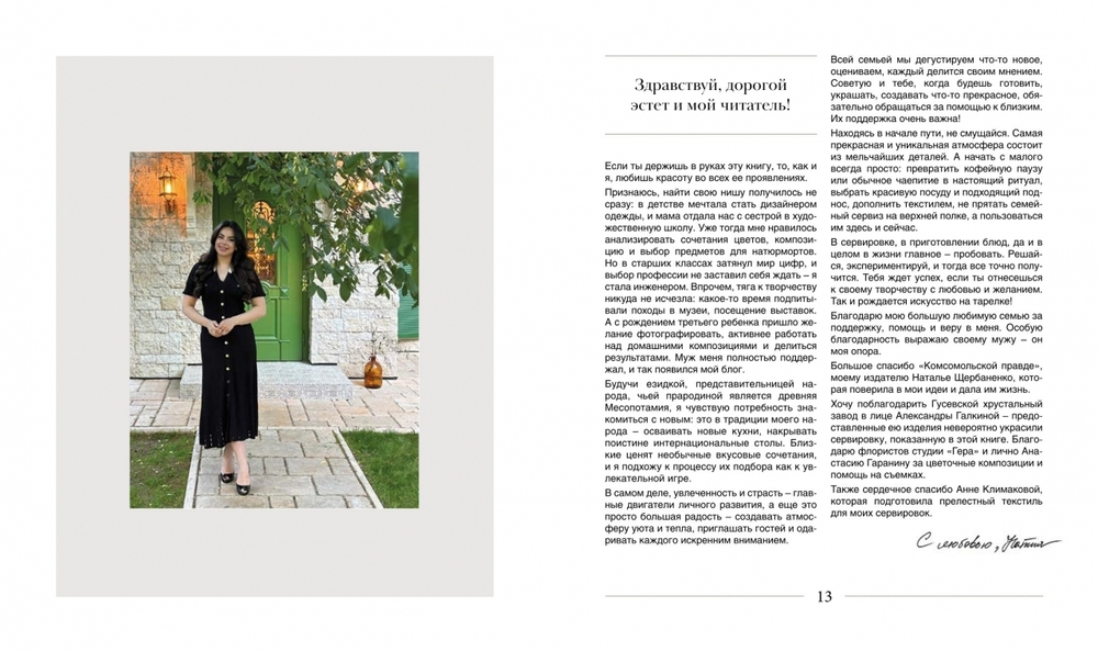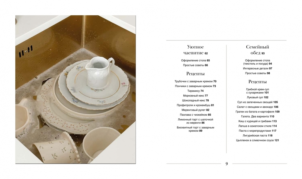 Нас ждут не только советы по декору, но и проверенные домашние рецепты: румяные блинчики с мясом, взбитые яйца с икрой, гратен из батата и картофеля, луковый суп, куриный рулет с тархуном и аджикой, лосось в сливочно-икорно соусе, пончики с кремом, фисташковая пахлава с чизкейком и еще множество идей для красивого кулинарного быта.