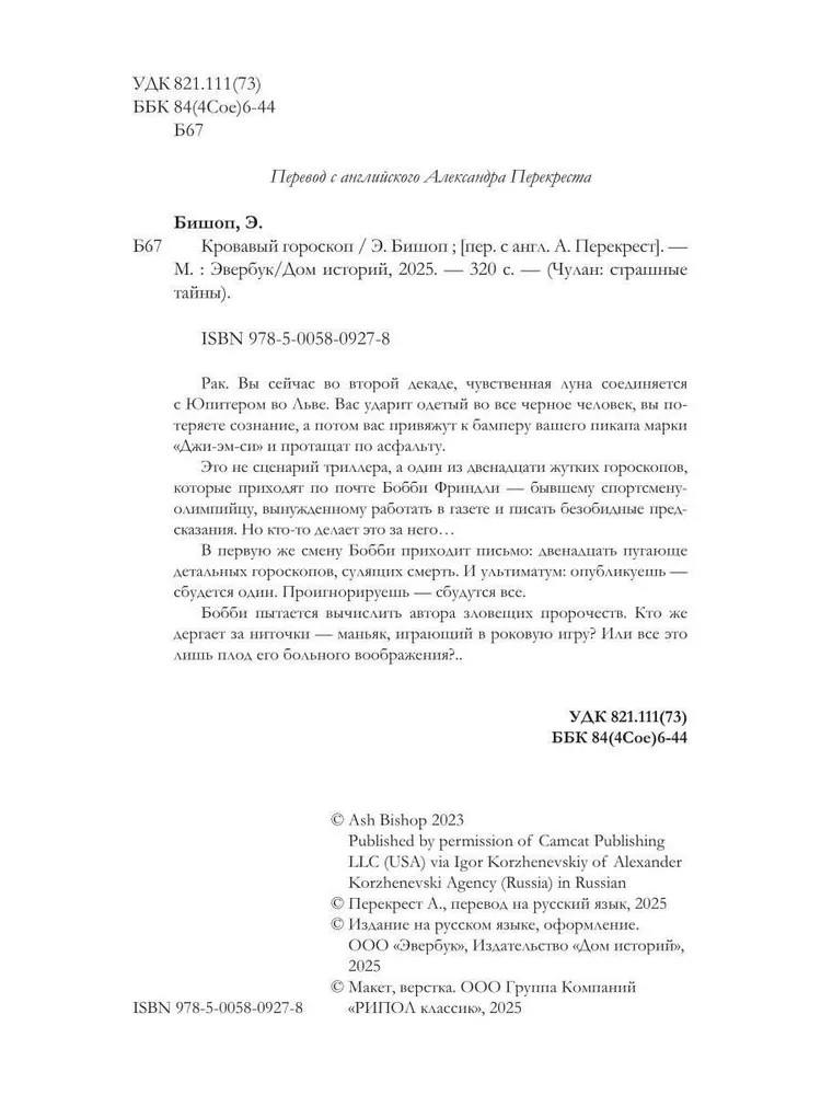 Это не сценарий триллера, а один из двенадцати жутких гороскопов, которые приходят по почте Бобби Фриндли – бывшему спортсмену-олимпийцу, вынужденному работать в газете и писать безобидные предсказания. Но кто-то делает это за него…