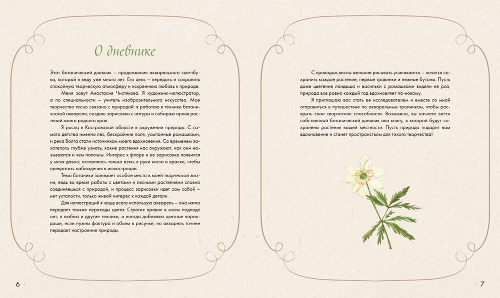 Погрузитесь в мир природы, акварели и творчества вместе с ботаническим дневником и авторской раскраской. Внутри – настоящий творческий путеводитель по лесным тропинкам: от весенних ростков до августовских грибных полян. Вас ждут акварельные иллюстрации растений, страницы для собственных зарисовок, заметок и даже гербария. Анастасия Чистякова – художник-иллюстратор, учитель изобразительного искусства и выпускница Института культуры и искусств – делится личными находками: как подбирать материалы, рисовать с натуры и выстраивать ботаническую композицию. Откройте дневник, возьмите кисти, краски – и отправляйтесь в акварельное путешествие!