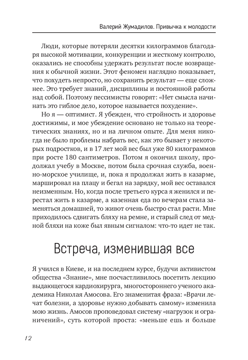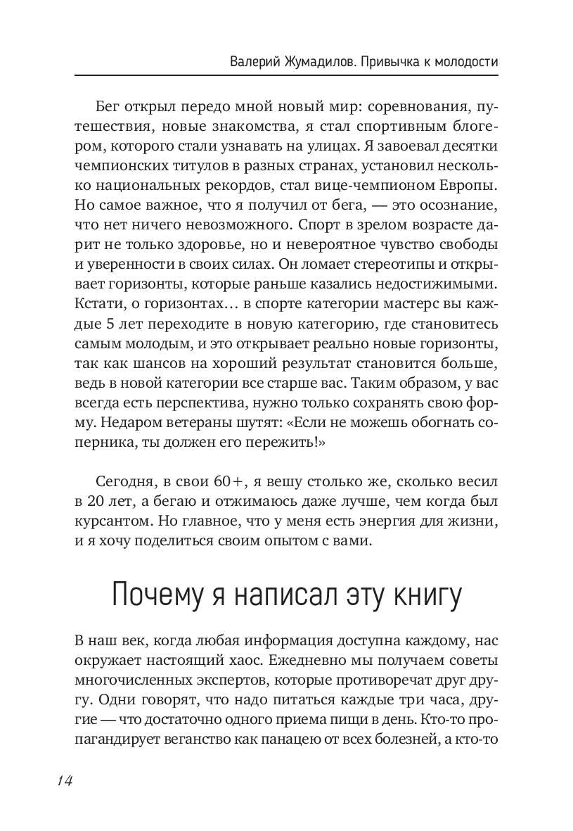 Мечтаете быть здоровым и полным энергии? Хотите выглядеть на все 100 % и жить в гармонии с собой и своим телом? Эта книга – ваш проводник к здоровому телу и ясной голове, независимо от возраста, маршрут к жизни, в которой вы нравитесь себе в зеркале, не задыхаетесь от подъема по лестнице и просыпаетесь с энергией! Автор книги – Валерий Жумадилов пришел в спорт после 35 лет и добился ошеломляющих результатов, став вице-чемпионом Европы по легкой атлетике! А после 50 лет занялся бегом!
