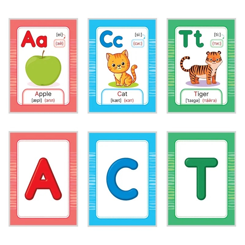 Карточки сделаны таким образом, что на одной из сторон изображены крупные буквы без иллюстраций. А это значит, что, освоив алфавит, ребёнок сможет с помощью взрослых складывать простые слова.