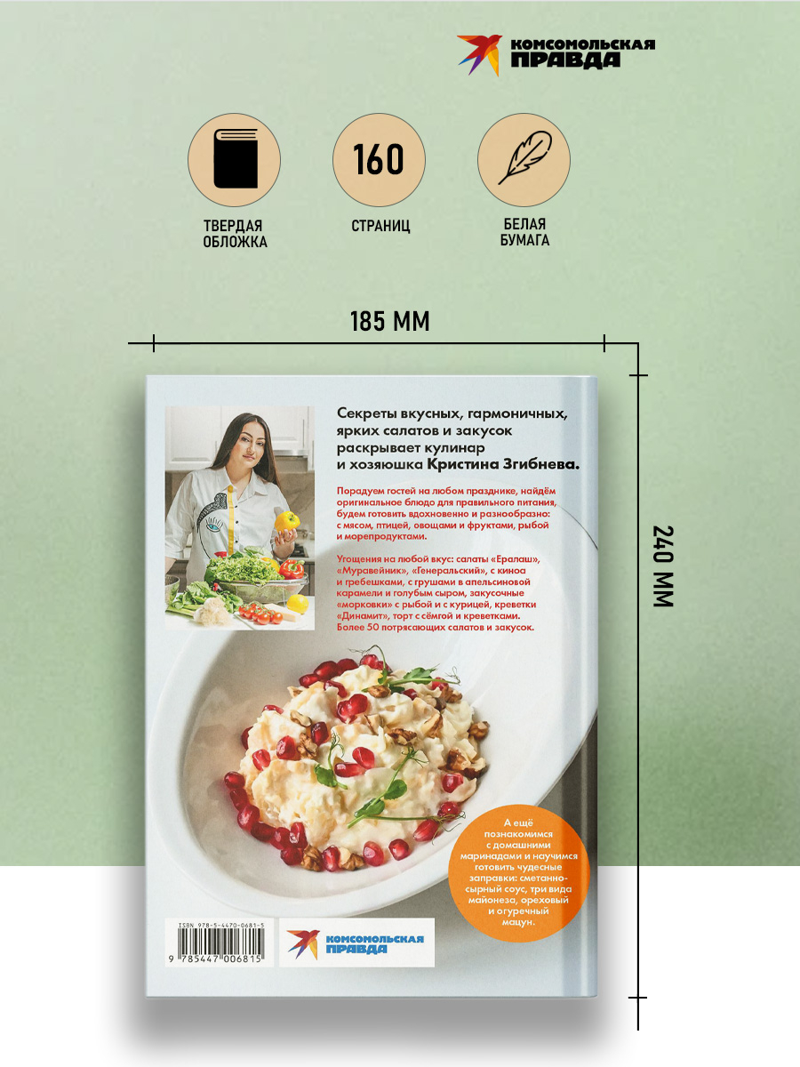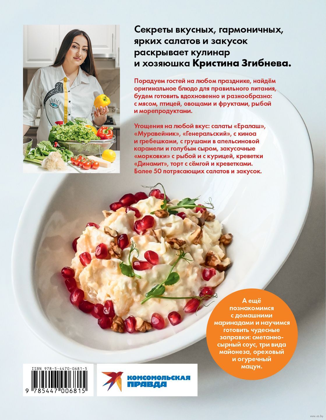 Секреты вкусных, гармоничных, ярких салатов и закусок раскрывает кулинар и хозяюшка Кристина Згибнева. Порадуем гостей на любом празднике, найдем оригинальные блюда для правильного питания, для торжественных случаев и закусок «на скорую руку», будем готовить вдохновенно и разнообразно: с мясом, птицей, овощами и фруктами, рыбой и морепродуктами. Угощения на любой вкус: салаты "Ералаш", "Муравейник", "Генеральский", с киноа и гребешками, с грушами в апельсиновой карамели и голубым сыром, закусочные "морковки" с рыбой и с курицей, креветки "Динамит", торт с семгой и креветками. Более 50 потрясающих салатов и закусок. А еще познакомимся с домашними маринадами и научимся готовить чудесные заправки: сметанно-сырный соус, три вида майонеза, ореховый и огуречный мацун. Салатов много не бывает!