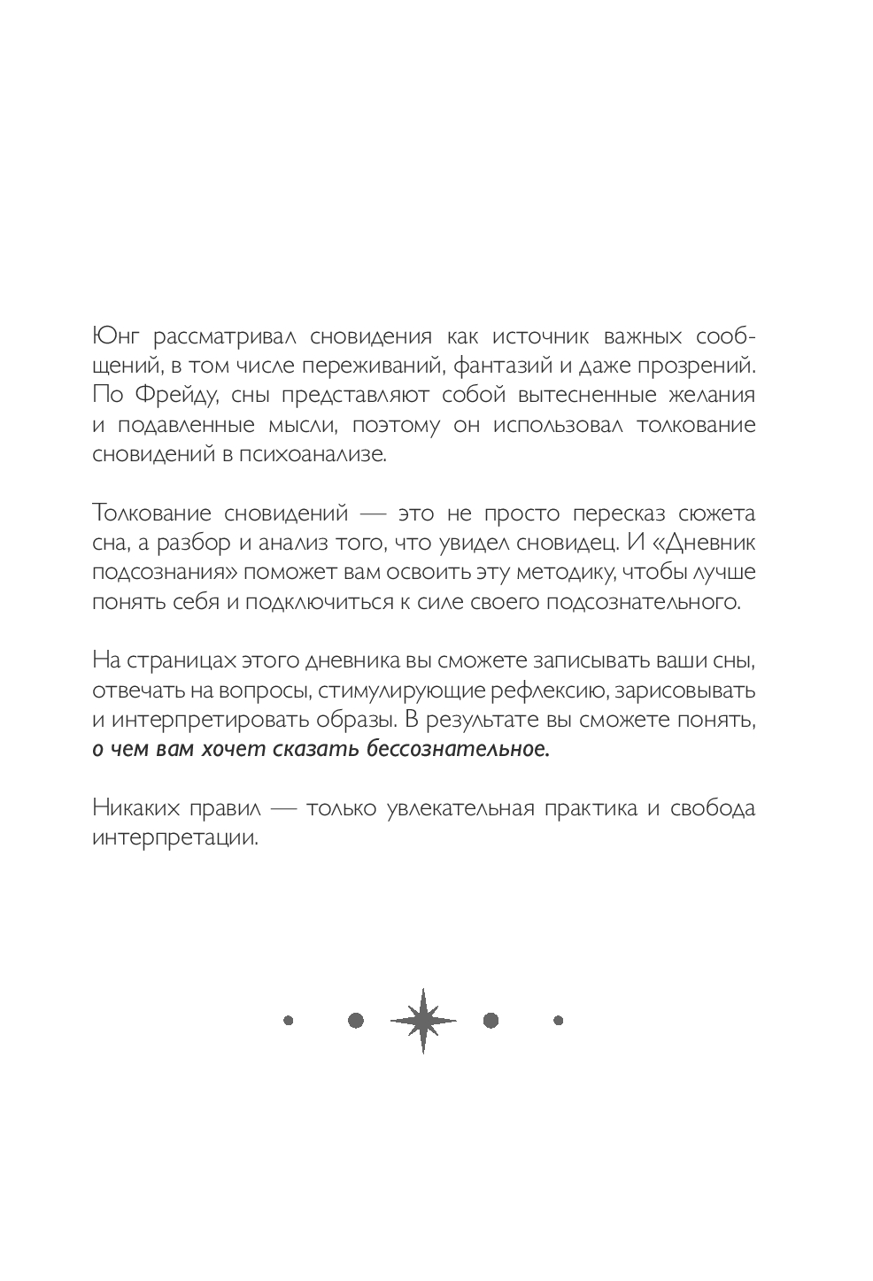 Каждый раз, засыпая, вы отправляетесь в самое загадочное из путешествий – в мир собственного подсознания. Там, среди туманных образов и причудливых сюжетов, скрыты ключи к вашим страхам и желаниям, решения проблем и источники безграничного вдохновения. Но что, если бы у вас появилась карта этого мира? Инструмент, который превращает хаос сновидений в ясные и четкие подсказки? Для этих целей и составлен "Дневник подсознания". Это не просто блокнот для записи снов, а личный гид, который всегда под рукой. Заполняйте трекер сновидений, подводите итоги месяца, дайте волю чувствам и проводите время с собой, чтобы открыть для себя красоту и силу своего подсознания.
