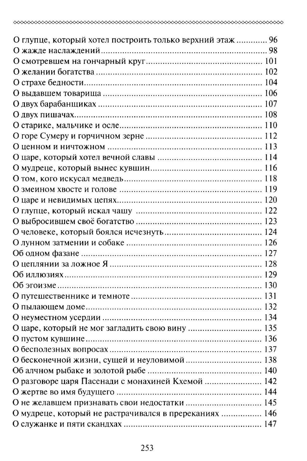 Каждый рассказ раскрывает человеческие слабости – глупость, жадность, гнев, привязанности – и показывает, как правильное понимание и следование Дхарме ведут к освобождению от страданий. В притчах действуют крестьяне и цари, мудрецы и глупцы, животные и духи – все они становятся героями поучительных историй, позволяя читателю через простые образы постичь глубокие истины.
