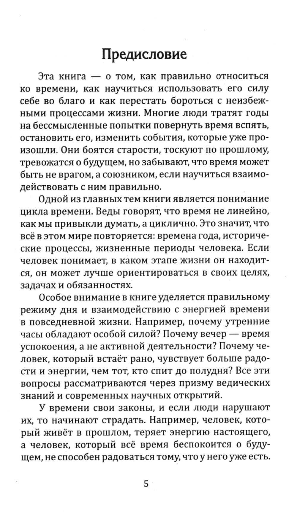 Однако Веды говорят, что время не просто течение часов и лет, это живая энергия, обладающая разумом, законами и влиянием. Когда человек понимает законы времени, он перестаёт страдать из-за прошлого, перестаёт бояться будущего и начинает жить в гармонии с настоящим. Эта книга поможет понять, как устроено время, как с ним взаимодействовать, как правильно планировать свою жизнь, не тратить его впустую и использовать его энергию для счастья и развития.
