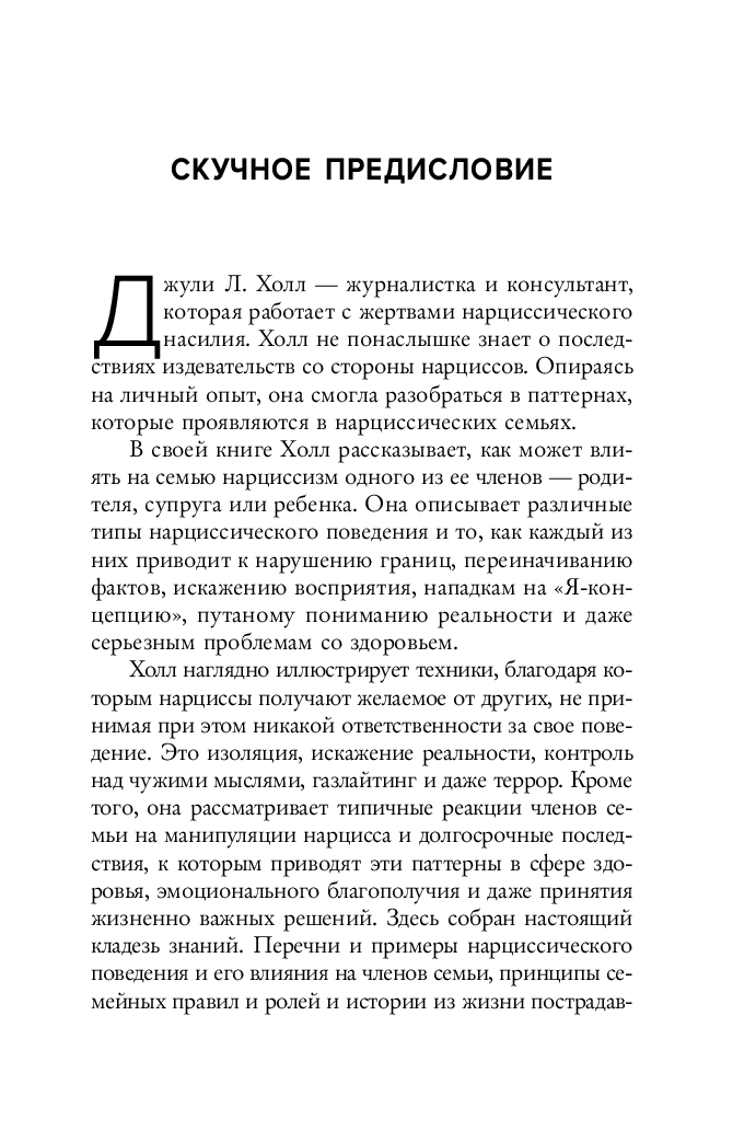 Как распознать нарцисса? Что происходит в нарциссической семье? Какие проблемы со здоровьем связаны с нарциссическим насилием? Эти и многие другие вопросы Джули Л. Холл, консультант по лечению психологических травм, освещает в своей книге. Это подробное руководство поможет вам не только преодолеть нарциссическую травму, нанесенную в детстве, но и перестроить паттерны своего поведения, чтобы выстроить личные границы.