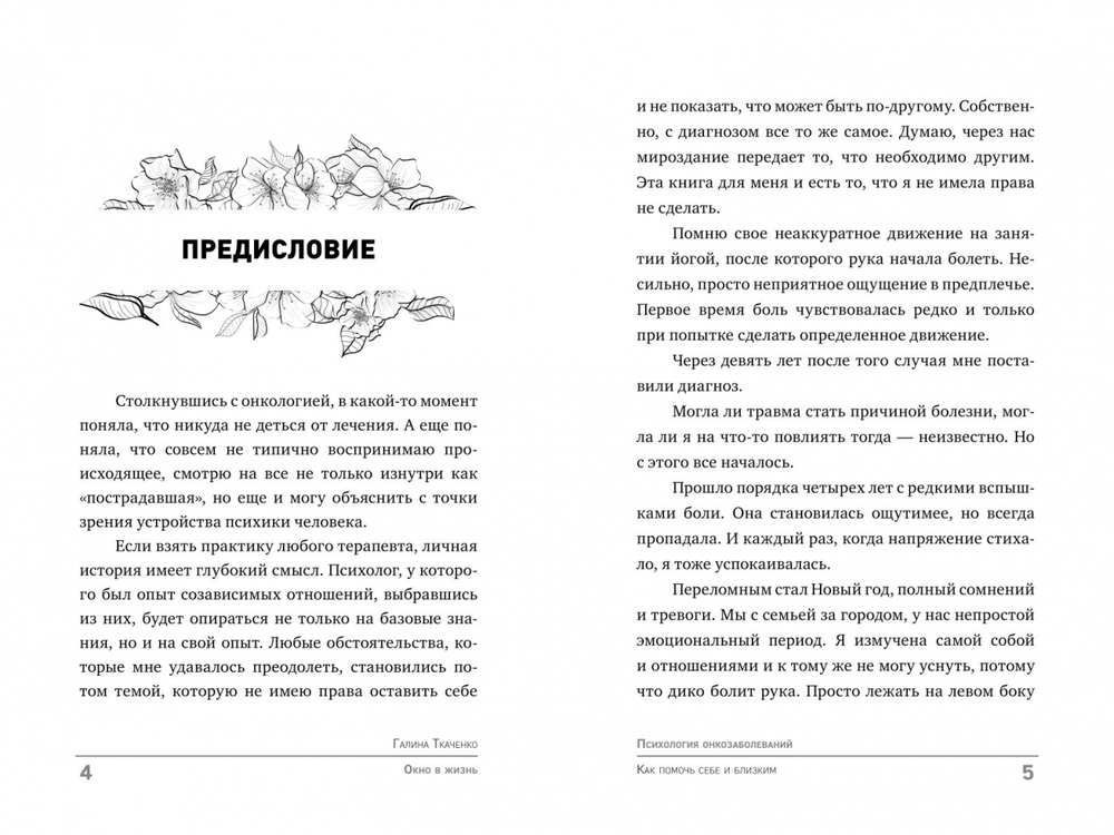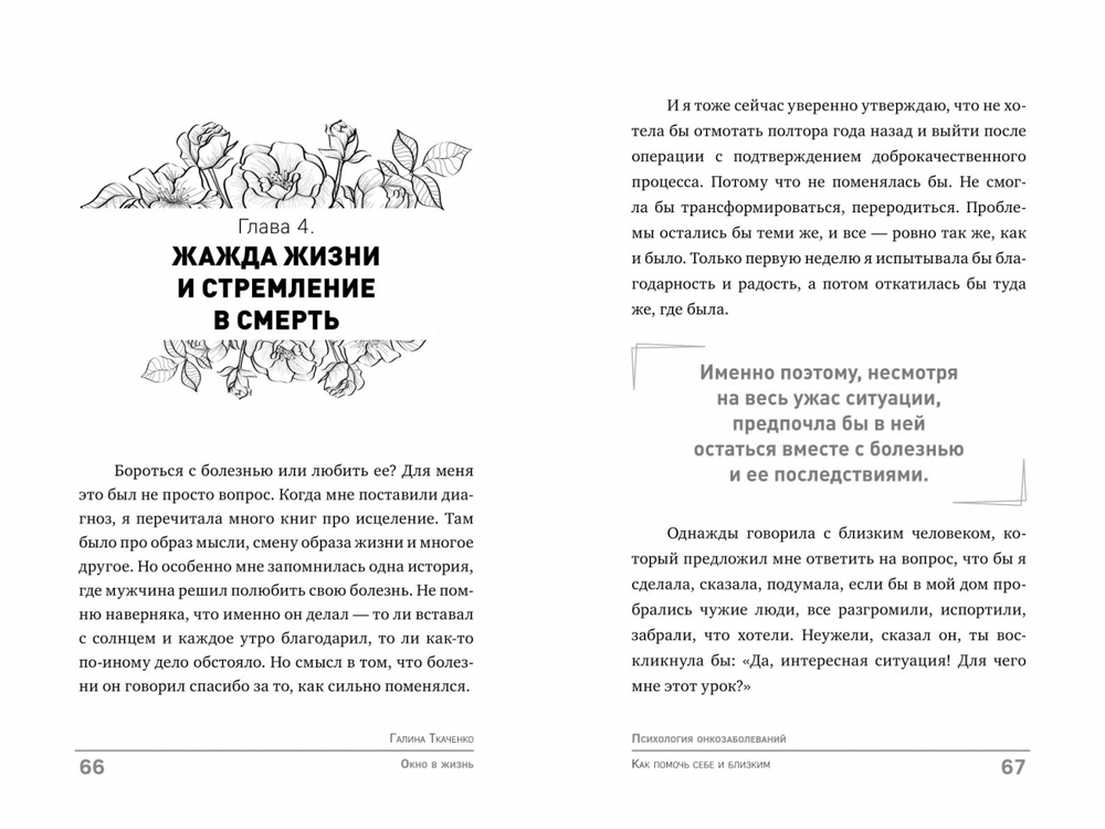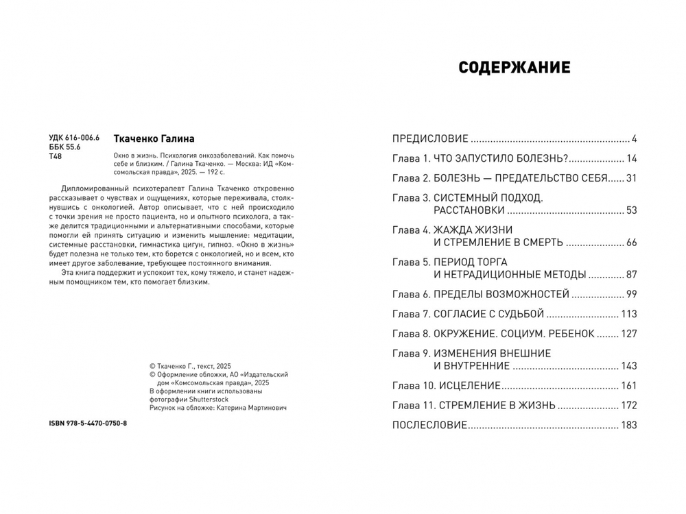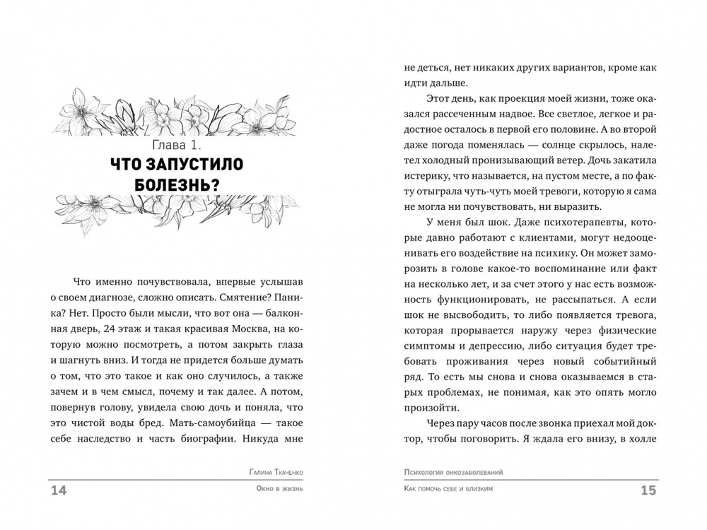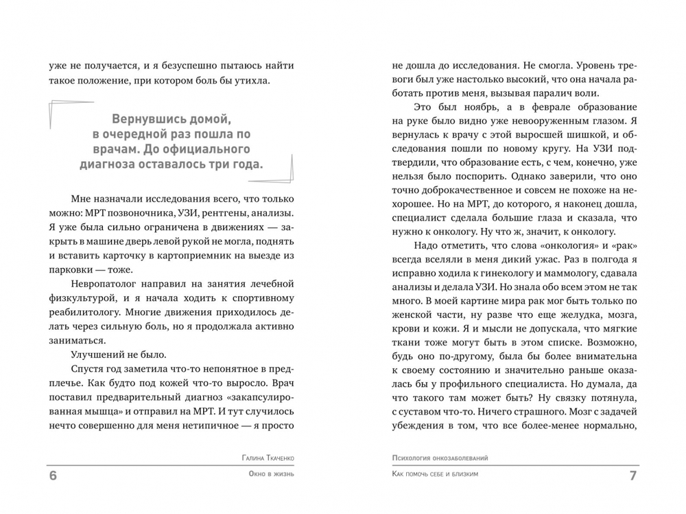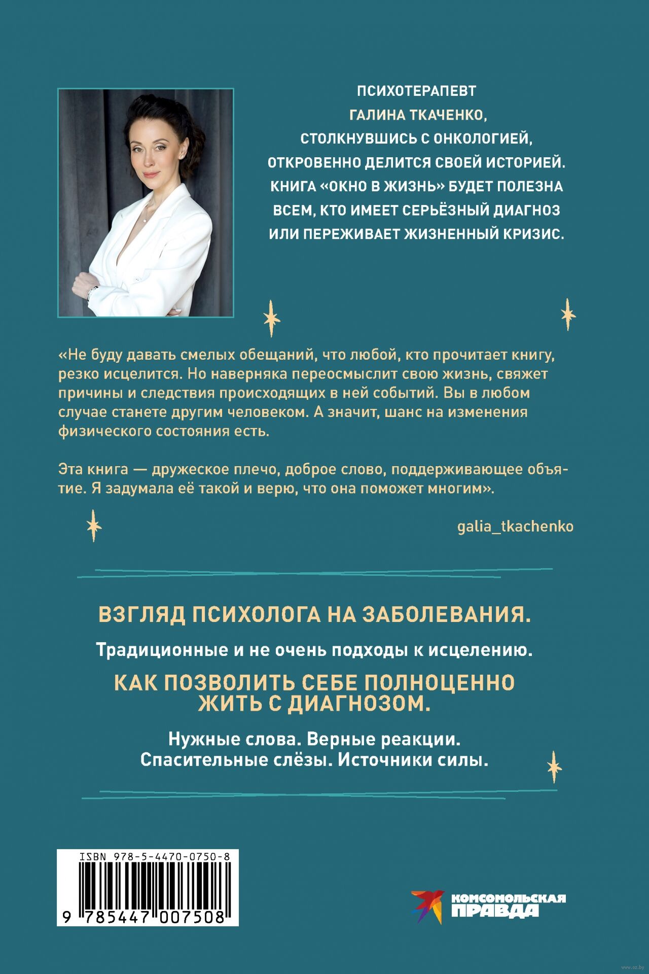 Дипломированный психотерапевт Галина Ткаченко откровенно рассказывает о чувствах и ощущениях, которые переживала, столкнувшись с онкологией. Автор описывает, что с ней происходило с точки зрения не просто пациента, но и опытного психолога, а также делится традиционными и альтернативными способами, которые помогли ей принять ситуацию и изменить мышление – медитации, системные расстановки, гимнастика цигун, гипноз. "Окно в жизнь" будет полезна не только тем, кто столкнулся с онкологией, но и всем, кто имеет другое заболевание, требующее постоянного внимания. Эта книга поддержит и успокоит тех, кому тяжело и станет надежным помощником тем, кто помогает близким.