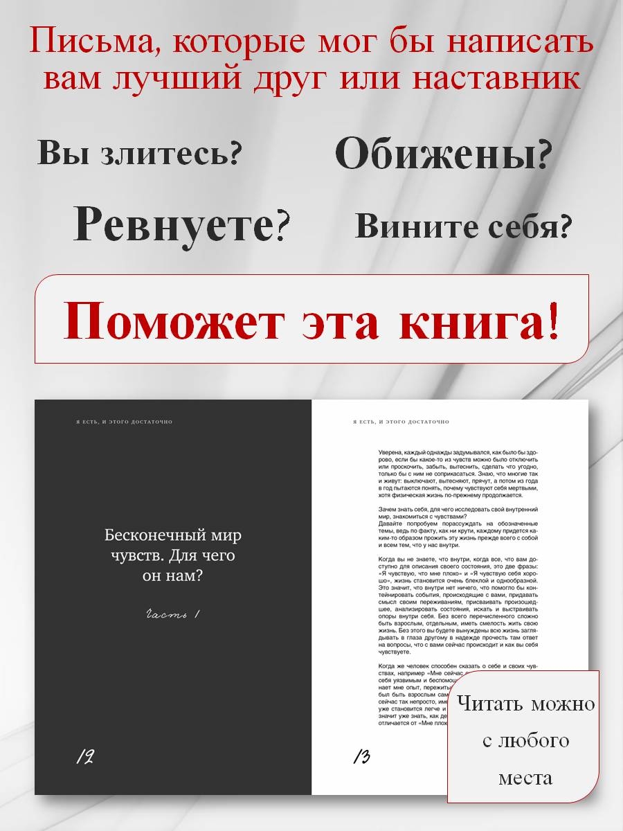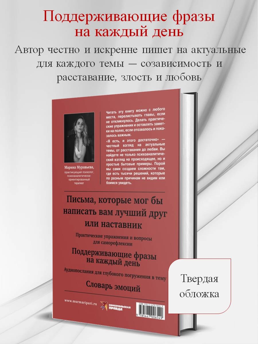 "Я есть, и этого достаточно" – сборник терапевтических писем, каждое из которых – возможность порефлексировать. Как понимать свои чувства – от жгучей обиды до разрушающей вины? Как научиться сохранять контакт с реальностью и эмоциями, когда, например, чувствуете себя беспомощной или разочарованной? Как, несмотря ни на что, выбирать себя? Ответы на эти и другие вопросы вы найдете в книге практикующего психолога Марины Муравьевой. Благодаря упражнениям, рекомендациям и словарю для выражения чувств научитесь описывать эмоциональные состояния, найдете выход из внутренних конфликтов и осознаете, что именно вы тот человек, который может раскрасить свою жизнь яркими красками. Книга будет полезна всем, кто увлекается психологией.