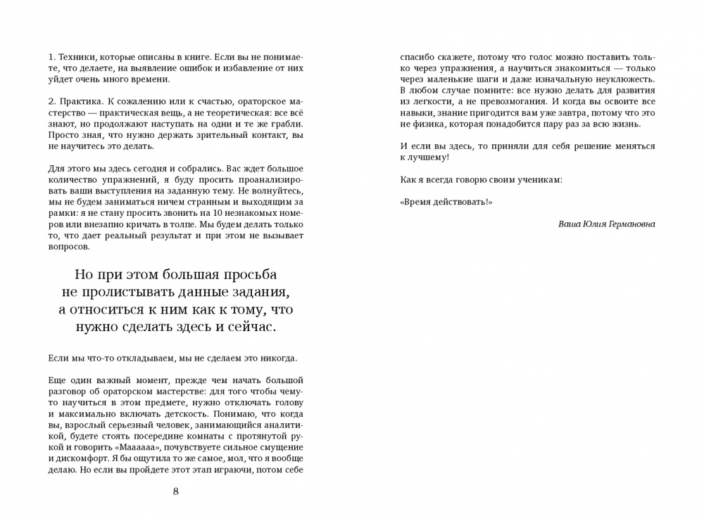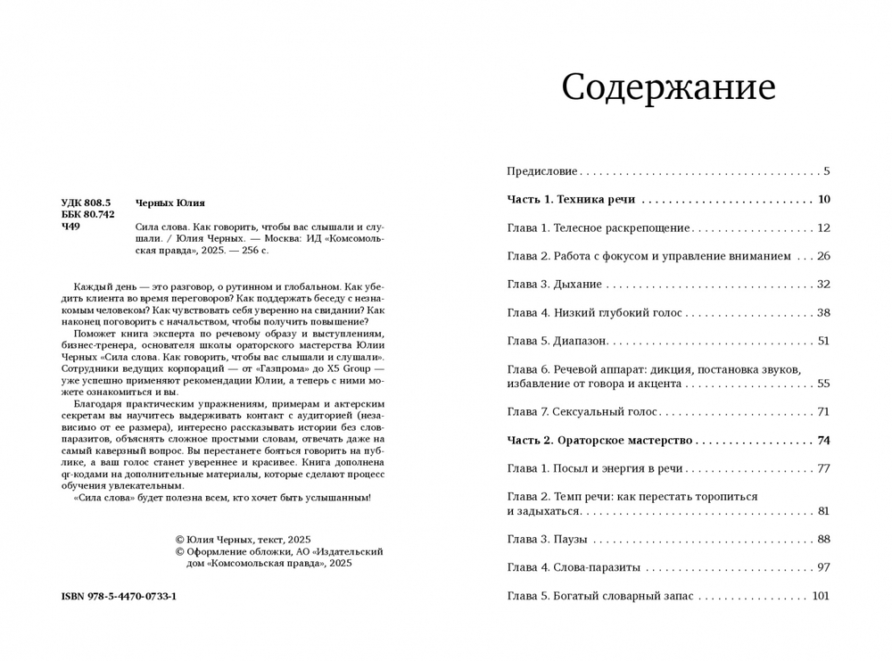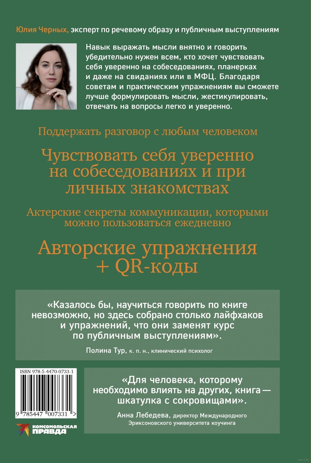 Каждый день – это разговор, о рутинном и глобальном. Как убедить клиента во время переговоров? Как поддержать беседу с незнакомым человеком? Как чувствовать себя уверенно на свидании? Как наконец поговорить с начальством, чтобы получить повышение? Поможет книга эксперта по речевому образу и выступлениям, бизнес-тренера, основателя школы ораторского мастерства Юлии Черных "Сила слова. Как говорить, чтобы вас слышали и слушали". Сотрудники ведущих корпораций – от "Газпрома" до X5 Group – уже успешно применяют рекомендации Юлии, а теперь с ними можете ознакомиться и вы. Благодаря практическим упражнениям, примерам и актерским секретам вы научитесь выдерживать контакт с аудиторией (независимо от ее размера), интересно рассказывать истории без словпаразитов, объяснять сложное простыми словам, отвечать даже на самый каверзный вопрос. Вы перестанете бояться говорить на публике, а ваш голос станет увереннее и красивее. Книга дополнена qr-кодами на дополнительные материалы, которые сделают процесс обучения увлекательным. «Сила слова» будет полезна всем, кто хочет быть услышанным!