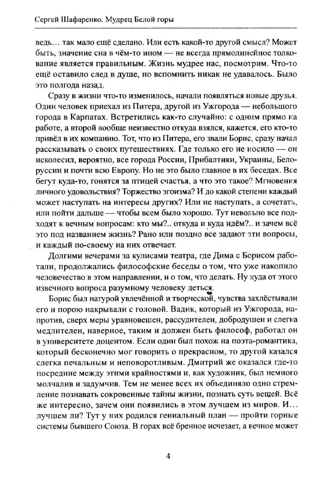 Повесть "Мудрец Белой горы" посвящена путешествиям по горным системам стран, бывших республик Советского Союза. Герои повести прошли по Карпатам, Крыму, Кавказу, Тянь-Шаню, Памиру и Алтаю. Но это не только путешествие по горам, это еще и духовные поиски смысла жизни, поиски истины, философские размышления и наставления из необыкновенных снов.