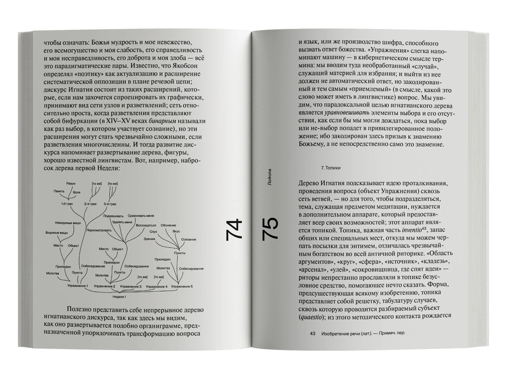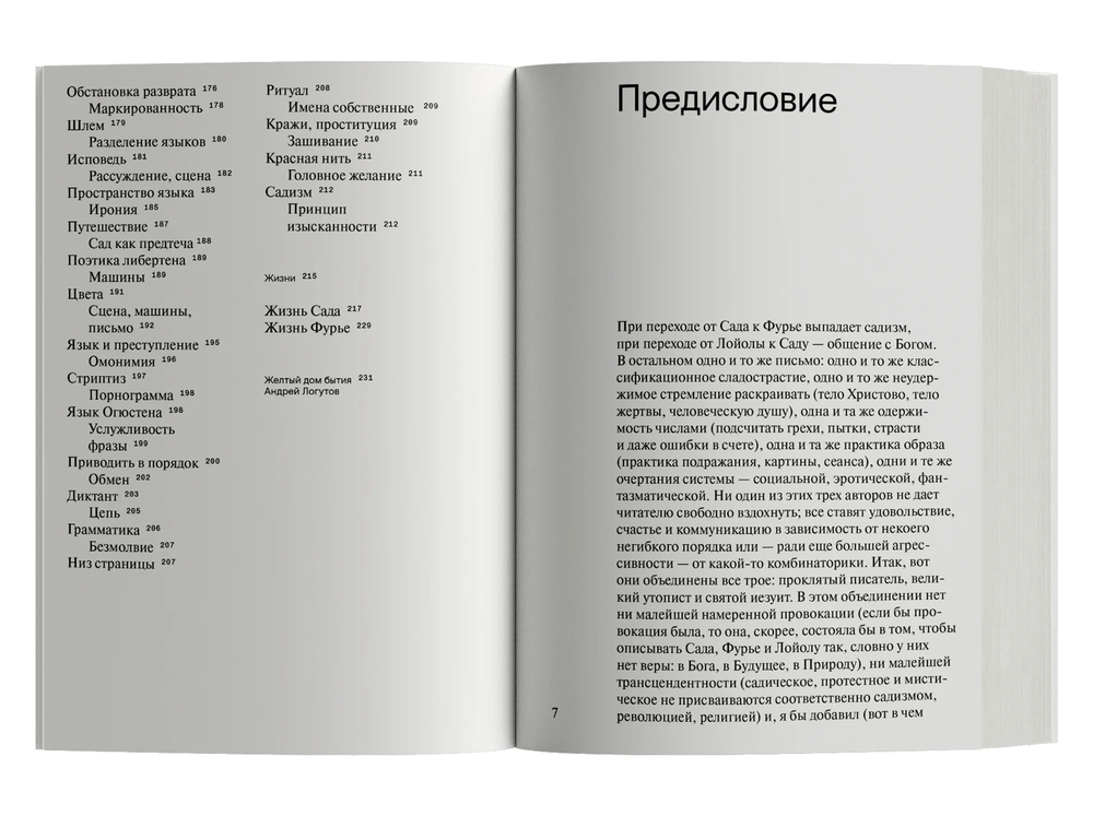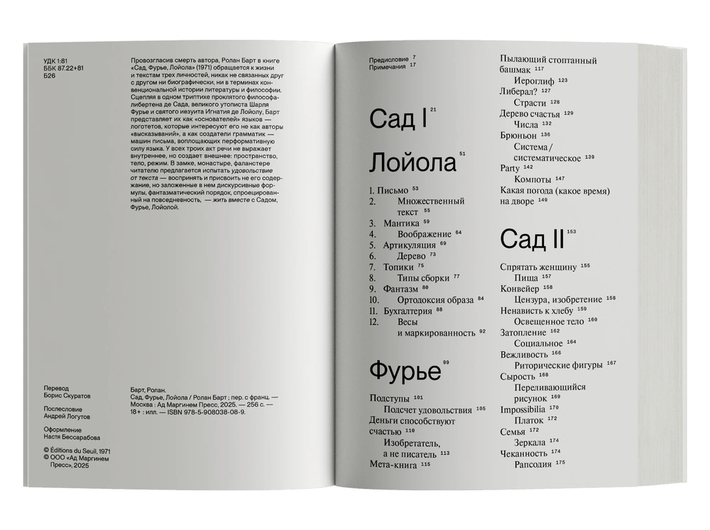 Сцепляя в одном триптихе проклятого философа-либертена де Сада, великого утописта Шарля Фурье и святого иезуита Игнатия де Лойолу, Барт представляет их как "основателей" языков – логотетов, которые интересуют его не как авторы "высказываний", а как создатели грамматик – машин письма, воплощающих перформативную силу языка. У всех троих акт речи не выражает внутреннее, но создает внешнее: пространство, тело, режим.