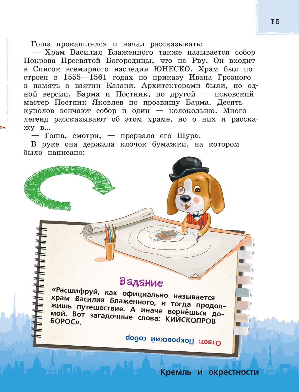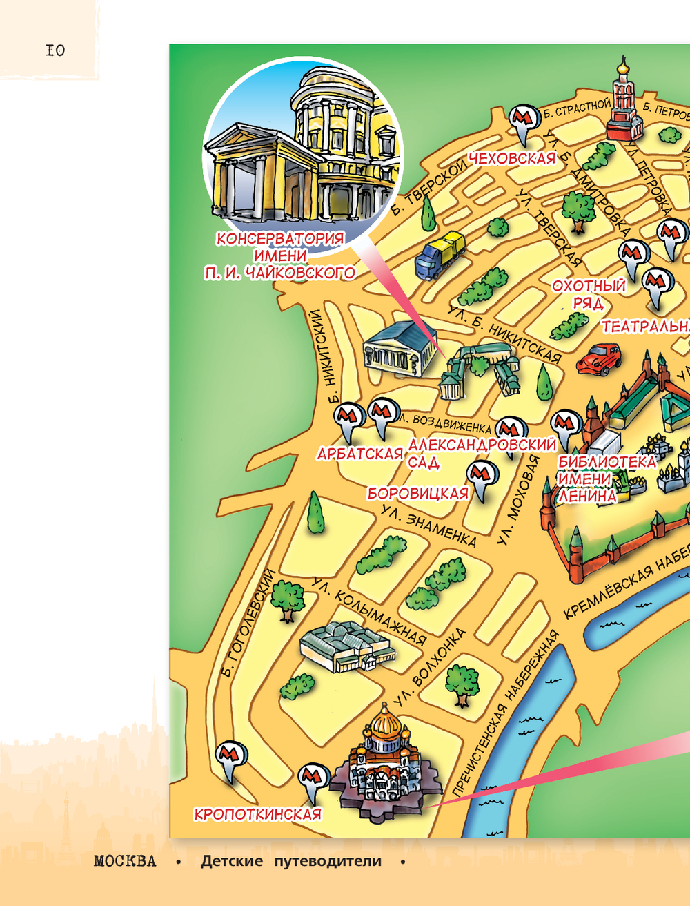 Хорошо ориентироваться в городе вам помогут красочные карты и схема московского метро. Кроме того, в путеводителе вы найдете разнообразные задания и головоломки, с ними узнавать город станет еще веселее.