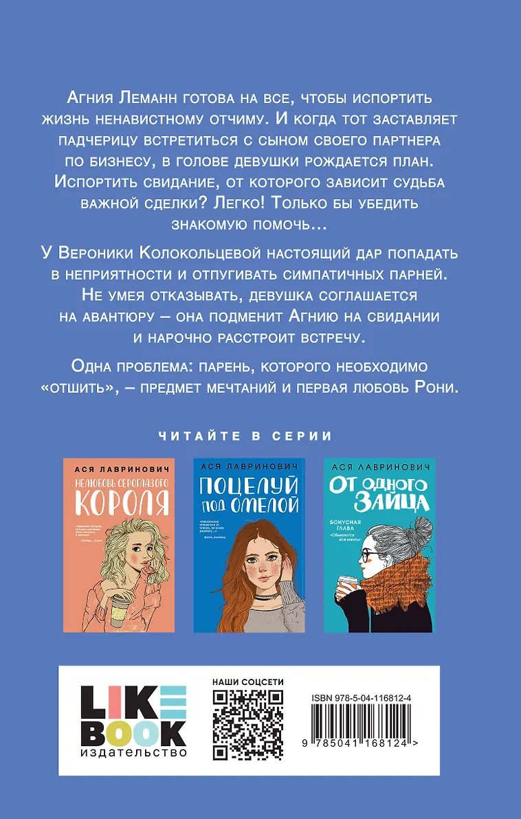 У Вероники Колокольцевой настоящий дар попадать в неприятности и отпугивать симпатичных парней. Не умея отказывать, девушка соглашается на авантюру – она подменит Агнию на свидании и нарочно расстроит встречу.