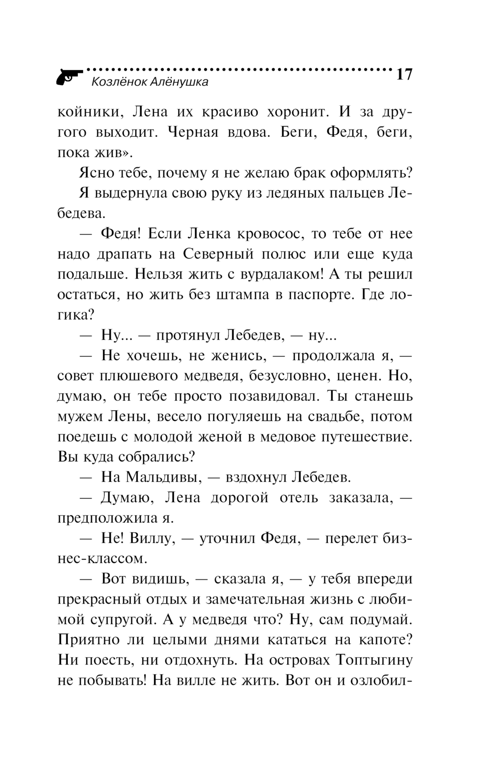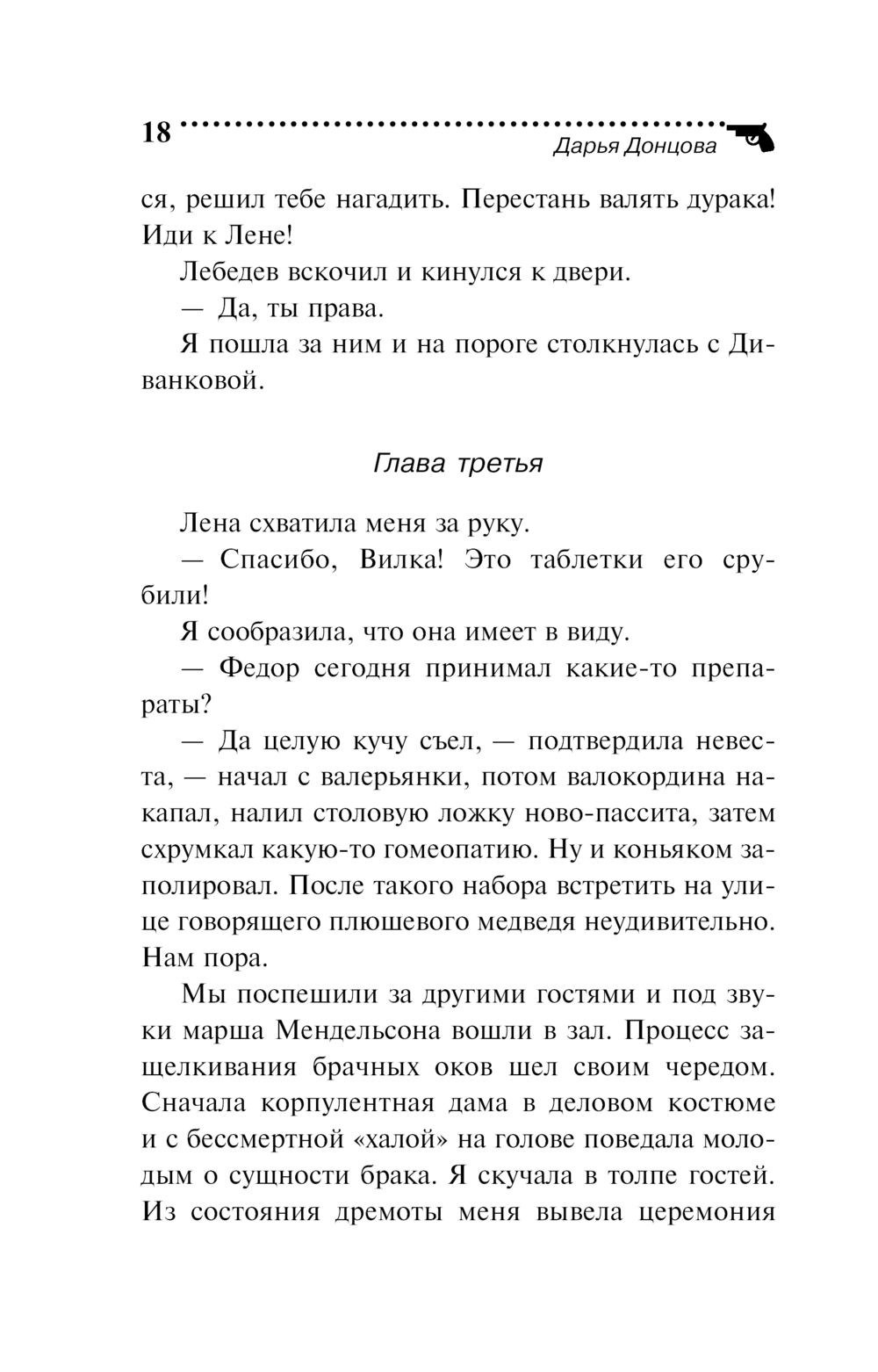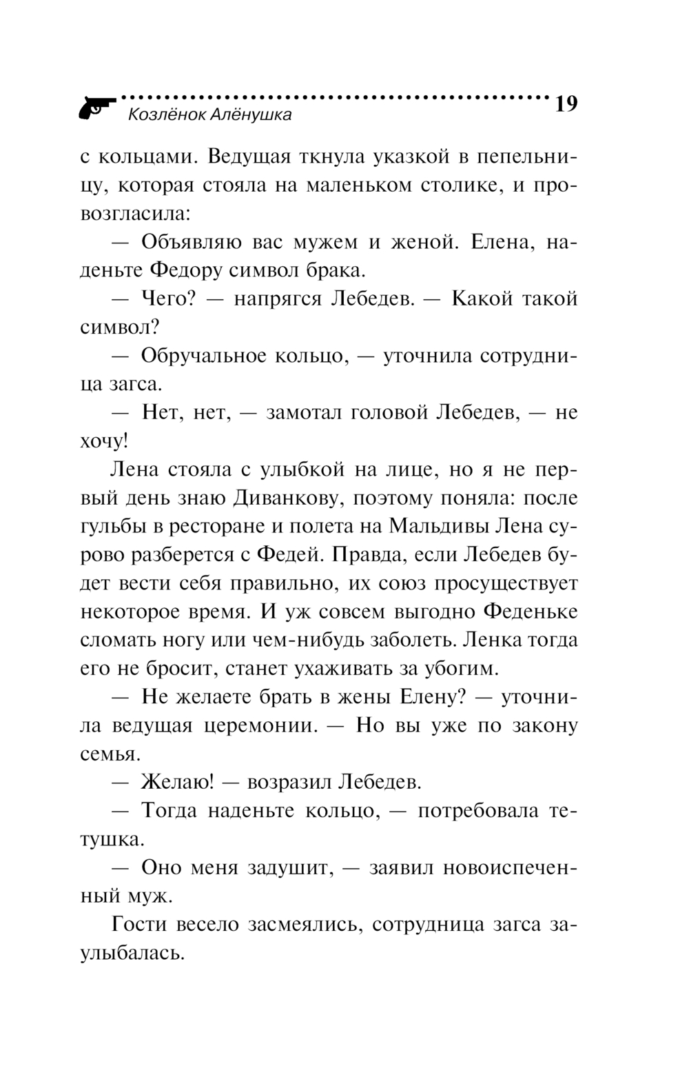Подруга Виолы Таракановой Елена Диванкова решила в очередной раз выйти замуж. В ЗАГСе ее жених Федор Лебедев внезапно отказался регистрировать брак. Видите ли игрушечный Топтыгин заговорил человеческим голосом! Сказал, что Ленка ведьма, и все ее мужья на том свете, а если Федя хочет избежать их участи, он не должен жениться на мегере. Вилка смогла его уговорить, и свадьба все же состоялась. Однако после первой брачной ночи Лебедев исчез…