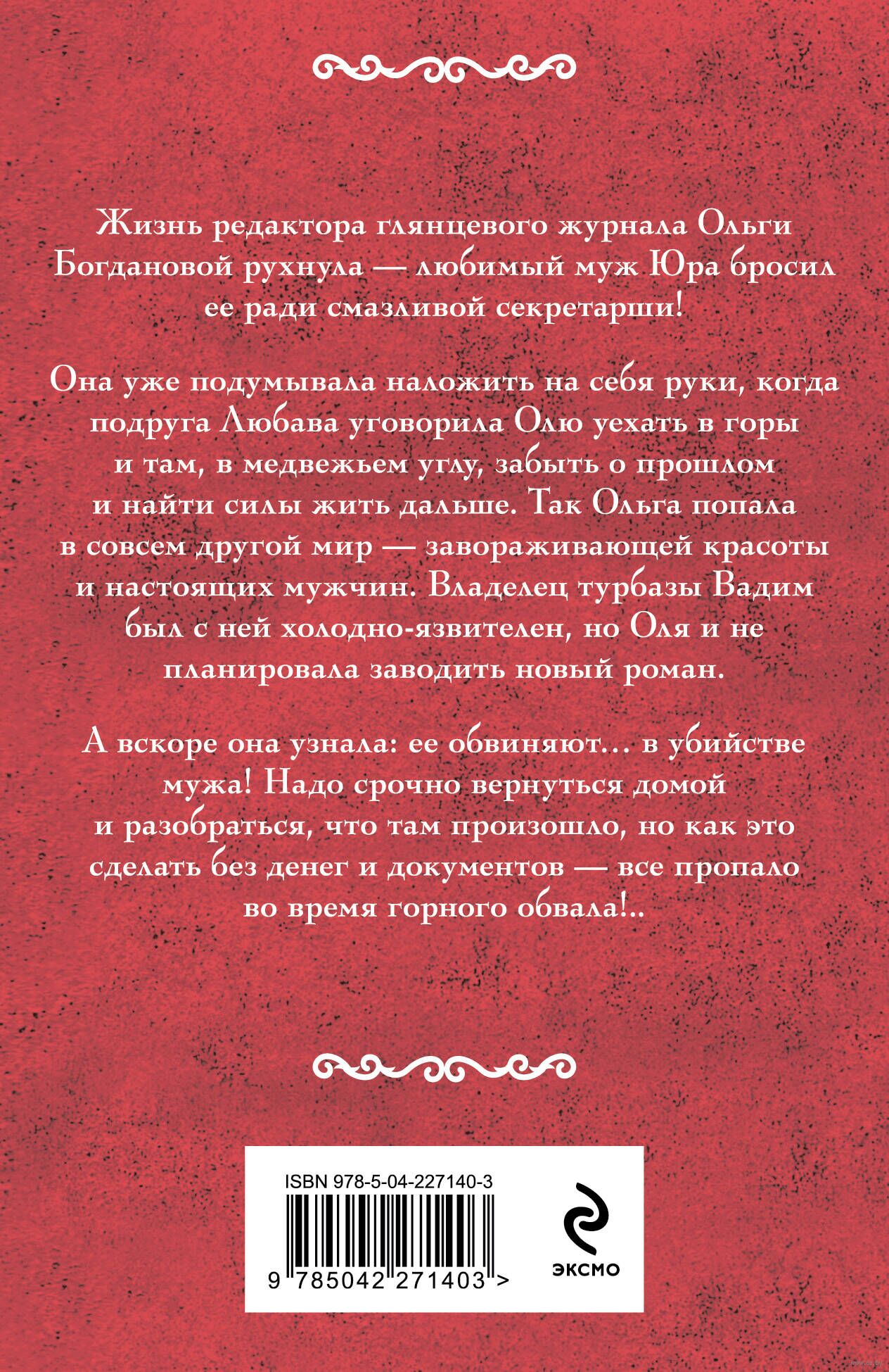 Жизнь редактора глянцевого журнала Ольги Богдановой рухнула – любимый муж Юра бросил ее ради смазливой секретарши! Она уже подумывала наложить на себя руки, когда подруга Любава уговорила Олю уехать в горы и там, в медвежьем углу, забыть о прошлом и найти силы жить дальше. Так Ольга попала в совсем другой мир – завораживающей красоты и настоящих мужчин. Владелец турбазы Вадим был с ней холодно-язвителен, но Оля и не планировала заводить новый роман. А вскоре она узнала: ее обвиняют… в убийстве мужа! Надо срочно вернуться домой и разобраться, что там произошло, но как это сделать без денег и документов – все пропало во время горного обвала!..