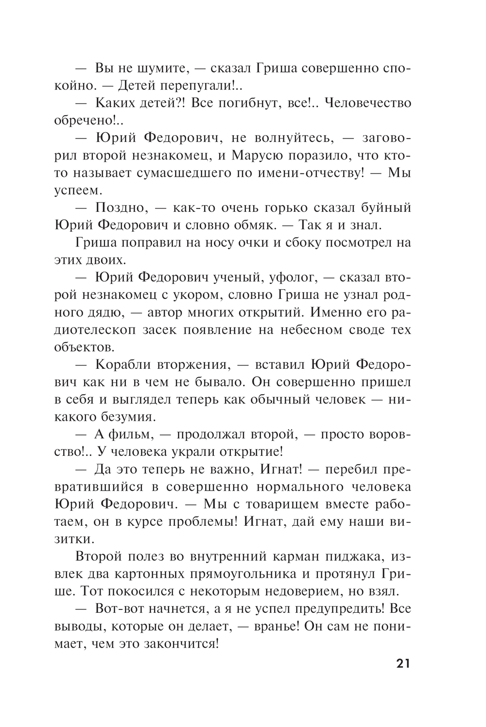 ...Конца света не случилось, однако в коридоре планетария найден труп. А – самое ужасное! – Маруся и ее друг детства Гриша только что беседовали с уфологом Юрием Федоровичем. Он был жив и здоров и предостерегал человечество от страшной катастрофы.
